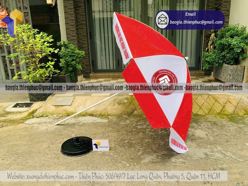 Mẫu dù lớn che nắng quảng cáo ngoài trời bán chạy - Xưởng sản xuất & Công Ty Thiên Phúc chuyên cung cấp nhiều mẫu ô/dù quảng cáo tròn lớn che ngoài trời & thiết kế - in ấn logo với kích thước chủ yếu 2.2m hoặc 2.4m hoặc lớn hơn 3m.Với giá dao động rẻ nhất - cạnh tranh nhất thị trường chỉ riêng cây ô dù: 600.000đ - 800.000đ/cây; đế dù mua lẻ: 150.000đ/cái. Nếu mua đế cùng cây dù giảm còn 100.000đ/cái. Đặt số lượng lớn nhận ngay nhiều chiết khấu ưu đãi. Hỗ trợ xuất hóa đơn VAT đỏ cho doanh nghiệp & công ty. Liên hệ ngay xưởng Thiên Phúc nhận ngay báo giá nhanh chóng và tư vấn thiết kế logo. Giao hàng nhanh trên toàn quốc.
