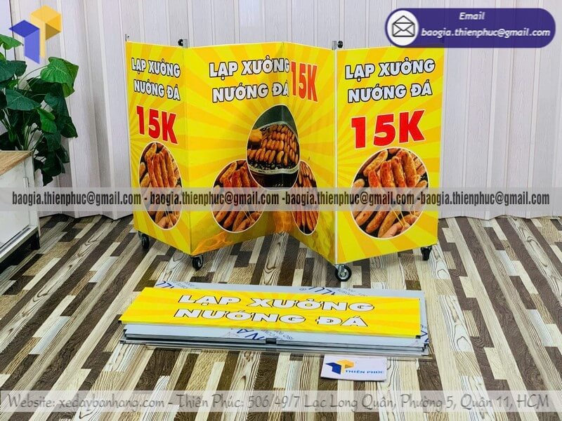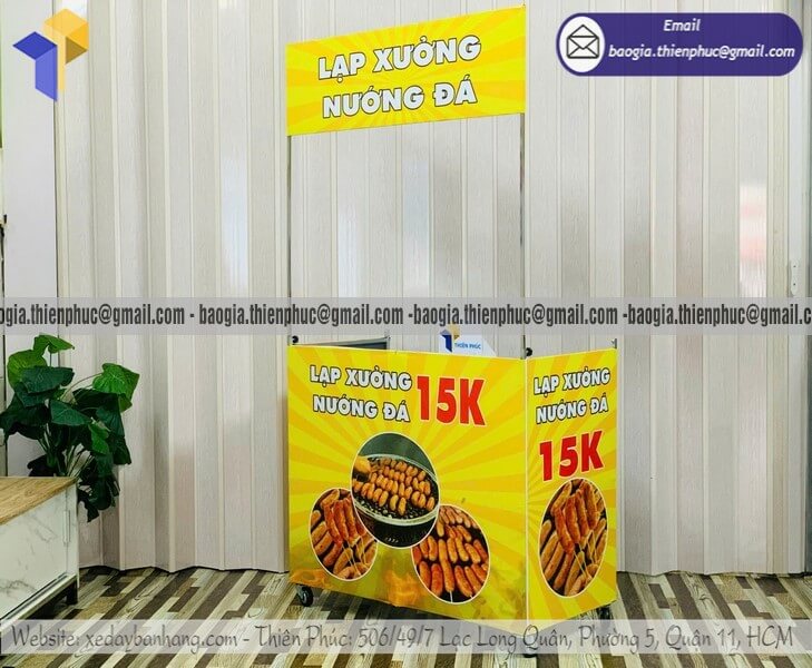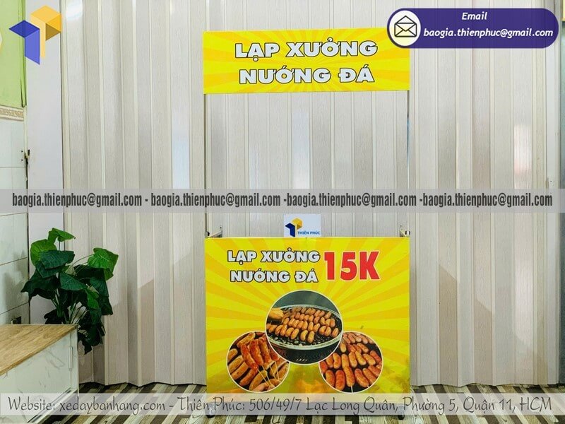 Mẫu kệ bán lạp xưởng nướng đá dạo di động xếp gọn giá rẻ - Xưởng sản xuất & Công Ty Thiên Phúc là xưởng chuyên nhận đặt làm theo yêu cầu - gia công - sản xuất - thiết kế & in ấn logo thương hiệu - nhãn hiệu - menu sản phẩm tủ bán hàng rong lắp ráp lưu động theo yêu cầu khách hàng với hơn 10 năm kinh nghiệm, cung cấp nhiều mẫu kệ/tủ/quầy/xe bán hàng gấp gọn lưu động, chỉ cần 700.000đ/xe trở lên với chất lượng ốp bạt,... chưa kèm theo chi phí khác như menu, đèn led, ô dù, kệ xếp,... Hỗ trợ xuất hóa đơn VAT. Đặt hàng từ 10 tủ trở trở lên giảm mỗi kệ 50.000đ. Giao hàng nhanh trên toàn quốc. Thiết kế logo hoàn toàn miễn phí.