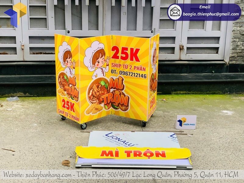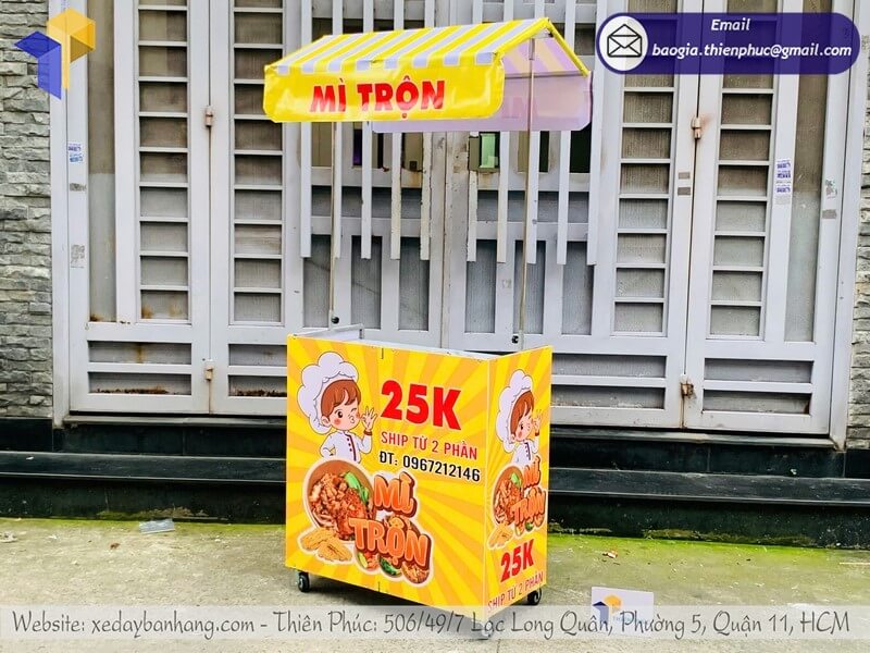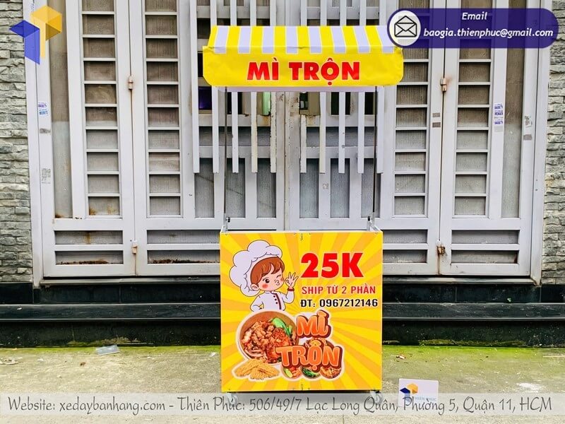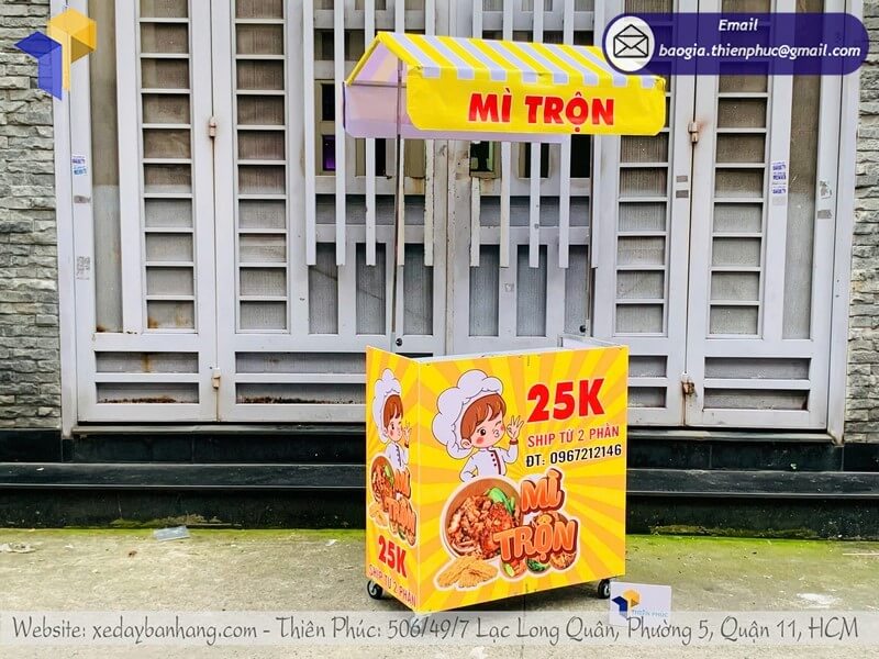 Tên sản phẩm: Mẫu kệ bán mì trộn gấp gọn có mái che trên vỉa hè có logo MÌ TRỘN 25K