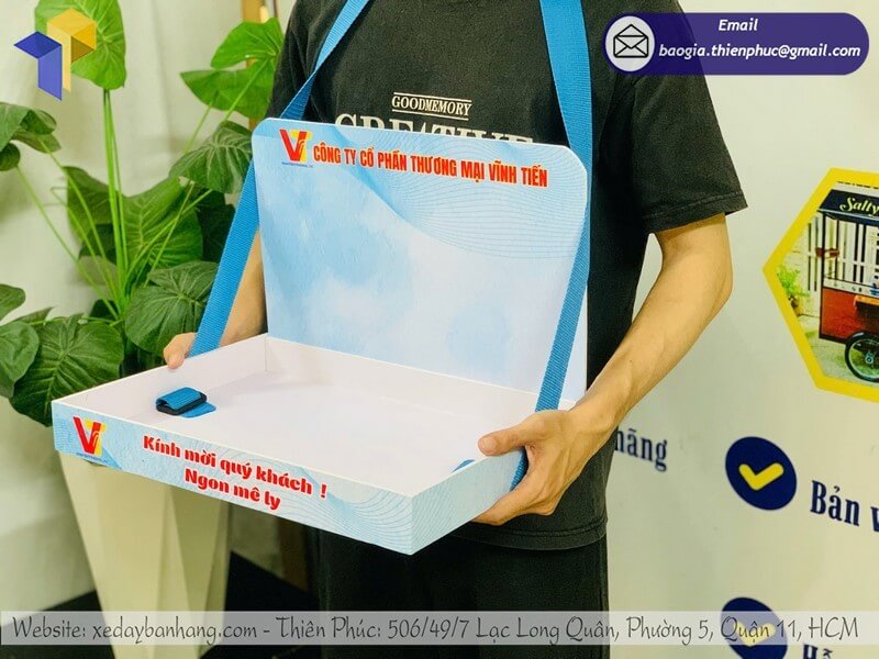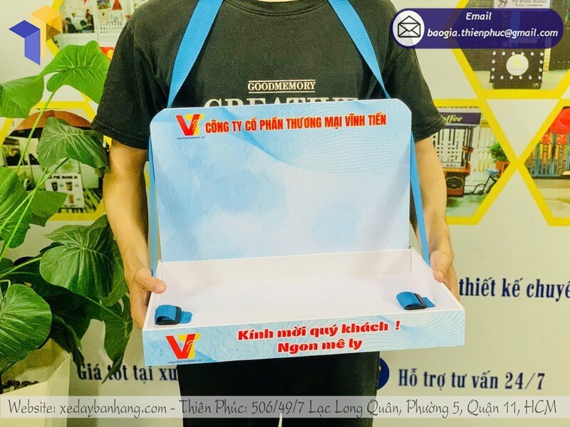 Khay PG sampling được thiết kế theo dáng đeo trước người, giúp nhân viên PG dễ dàng di chuyển trong khu vực sự kiện, hội chợ hoặc siêu thị.