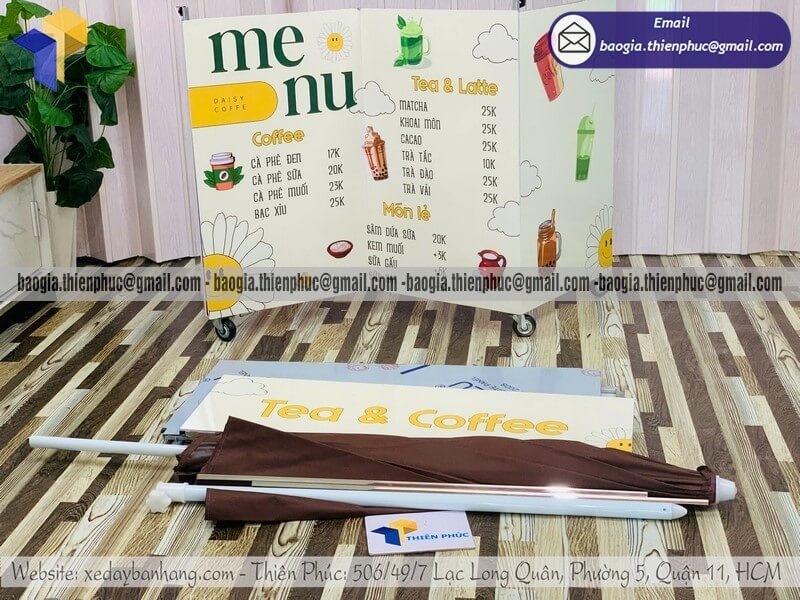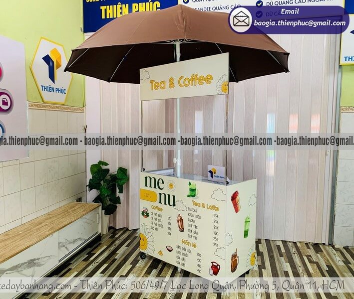Dù che đi kèm thường được in ấn đồng bộ với decal của quầy. Sự thống nhất về màu sắc và logo giữa xe và dù tạo nên một diện mạo vô cùng chuyên nghiệp. Một chiếc quầy bán cafe take away trông như một quán cafe thu nhỏ sẽ thu hút ánh nhìn từ xa hơn hẳn những sạp hàng tạm bợ.