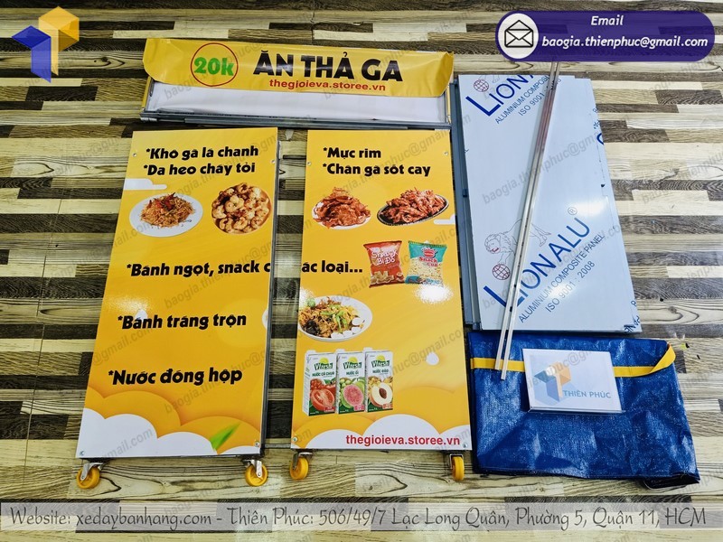 Quầy bán thức ăn nhanh dạo đang được rất nhiều người ưa thích trên thị trường hiện nay với kiểu dáng nhỏ gọn cùng thiết kế hiện đại. Xe bán đồ ăn mang đi thông thường phù hợp sử dụng để bán dạo, những đồ uống giải khát và các món đồ ăn vặt. Thiết kế xe bán lưu động hình hộp chữ nhật với 2 khoang đựng chính rộng rãi và vô cùng tiện lợi.