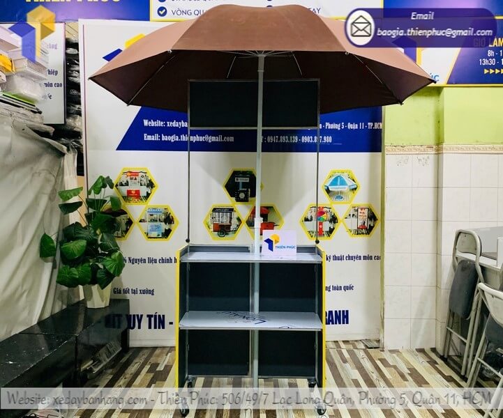 Mẫu tủ bán cafe dạo lưu động gấp gọn có dù che là giải pháp tối ưu cho kinh doanh cafe take-away, sự kiện và hội chợ ngoài trời. Với thiết kế thông minh, dễ di chuyển, bảo vệ sản phẩm và giá cả hợp lý, đây chính là lựa chọn giúp bạn bán hiệu quả mọi nơi. Hãy lựa chọn tủ từ xưởng Thiên Phúc để đảm bảo chất lượng, đa dạng mẫu mã và được hỗ trợ dịch vụ tốt nhất.