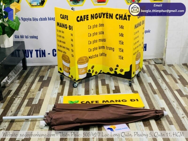 Mẫu tủ bán cafe dạo lưu động gấp gọn có dù che - Xưởng Thiên Phúc là xưởng sản xuất chuyên nhận đặt làm nhiều mẫu tủ có bánh xe bán cafe lưu động có thể gấp gọn với kích thước ngang 60cm, 80cm, 1m hoặc 1m2 với giá rẻ dao động chỉ từ 700.000đ/tủ trở lên (chưa kèm chi phí các phụ kiện đi kèm như ô dù che, kệ xếp, menu, vòng quay may mắn, đèn led). Thiết kế menu, logo nhãn hiệu thương hiệu miễn phí theo yêu cầu khách hàng. Liên hệ ngay Thiên Phúc để chúng tôi báo giá nhanh chóng chi tiết nhất và đặt hàng giao ngay trong ngày.