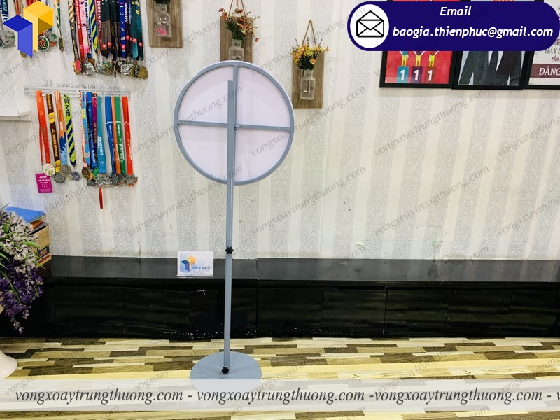 Chất lượng của vòng quay sát phạt chân đứng được làm từ sắt, ở bên ngoài có dán decall bao gồm một chân đứng và một vòng tròn. Trên vòng tròn được chia thành nhiều mục, bao gồm các cơ cấu giải thưởng và các nội dung mình muốn vận chuyển. , dễ dàng chuyển đổi. Dạng xoay vòng có chiều cao từ 1m60 đến 1m80 tùy chọn vào mục tiêu sử dụng, vị trí và diện tích mà bạn có thể thiết kế cho mình một sản phẩm phù hợp nhất.