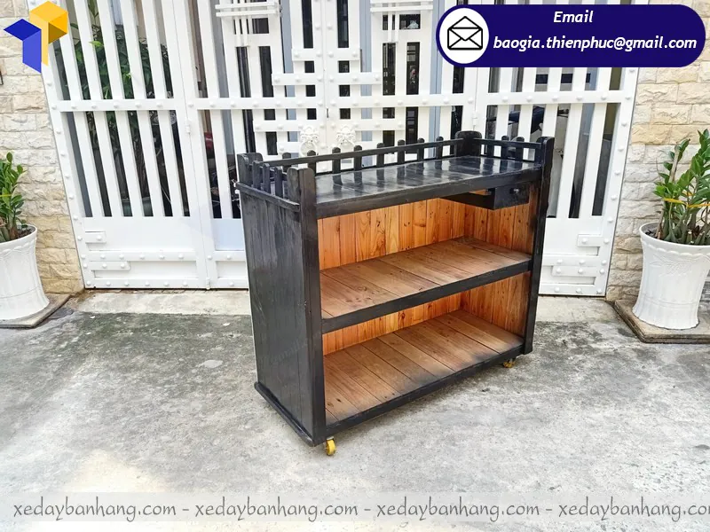 Chiếc xe bán cà phê không mái lưu động xinh xắn bạn đã có đầy đủ các chức năng cần thiết cho công việc của mình. Từ nơi pha chế, nơi cất ly tách, thìa, nơi cất nguyên vật liệu, ngăn đựng tiền, … Tất cả trong một, rất tiện dụng.