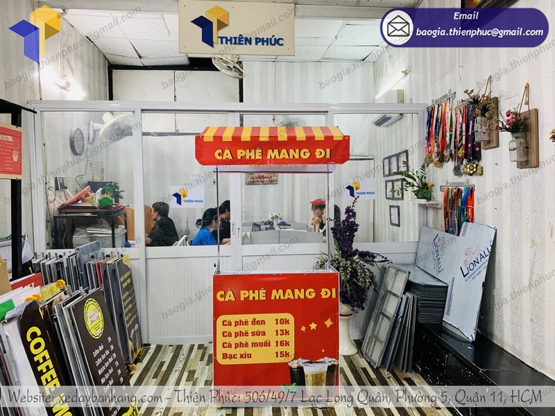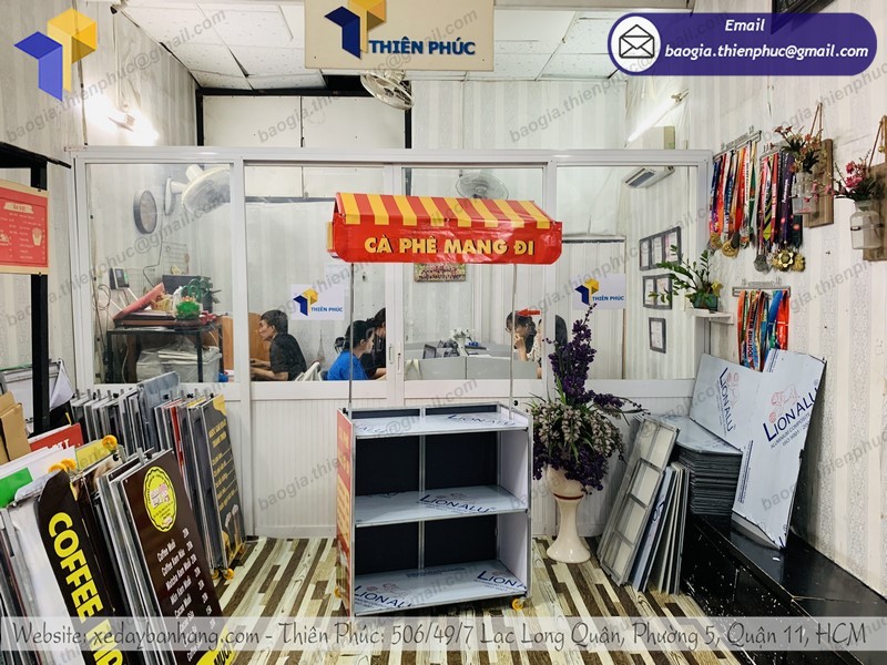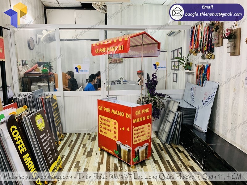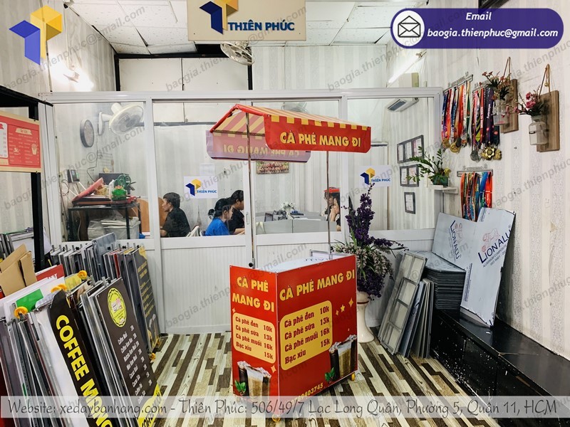 Công ty Thiên Phúc là một trong những địa chỉ chuyên sản xuất và phân phối xe bán gấp gọn tiện lợi đẹp, giá rẻ nhất mà bạn không thể bỏ qua. Với hơn 10 năm kinh nghiệm trong lĩnh vực gia công xe đẩy bán hàng, trong đó có tủ cà phê. Các sản phẩm gia công phân phối tại Thiên Phúc luôn được người tiêu dùng đánh giá cao: Chất lượng sản phẩm tốt – Mẫu mã đẹp độc lạ – Giá thành rẻ.