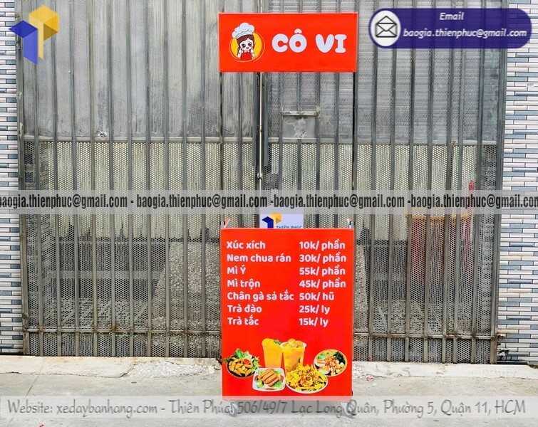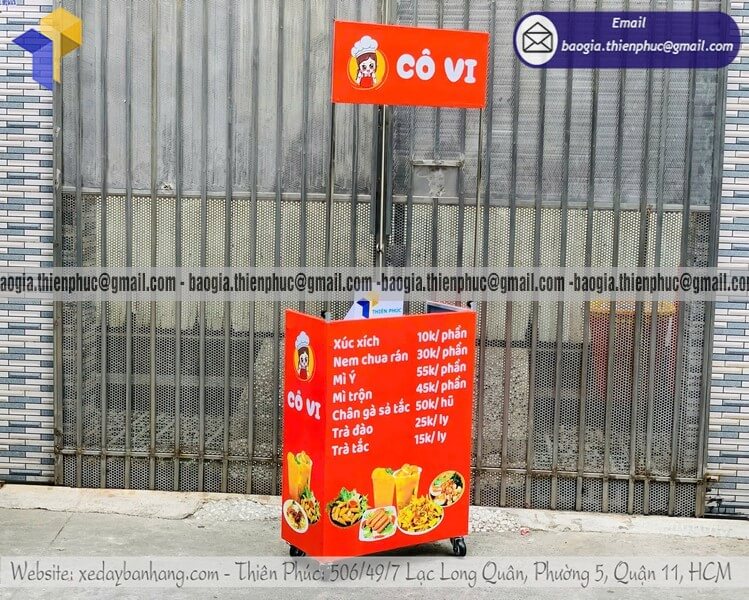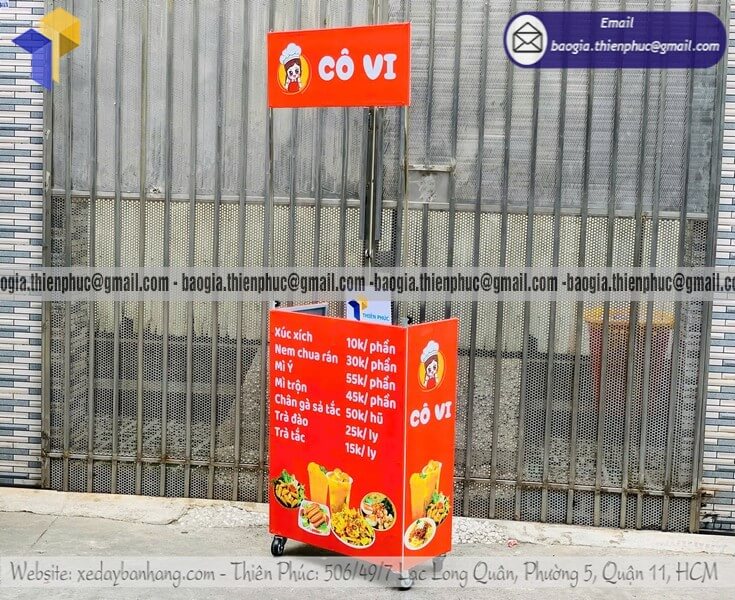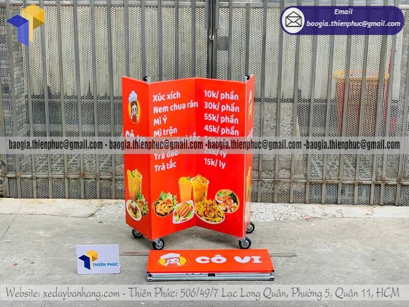 Có thể gắn bảng hiệu, mái che, dễ gấp gọn, phù hợp bán trước văn phòng, khu dân cư.