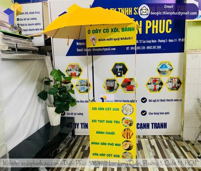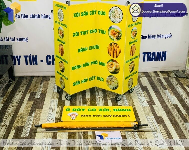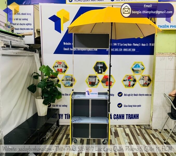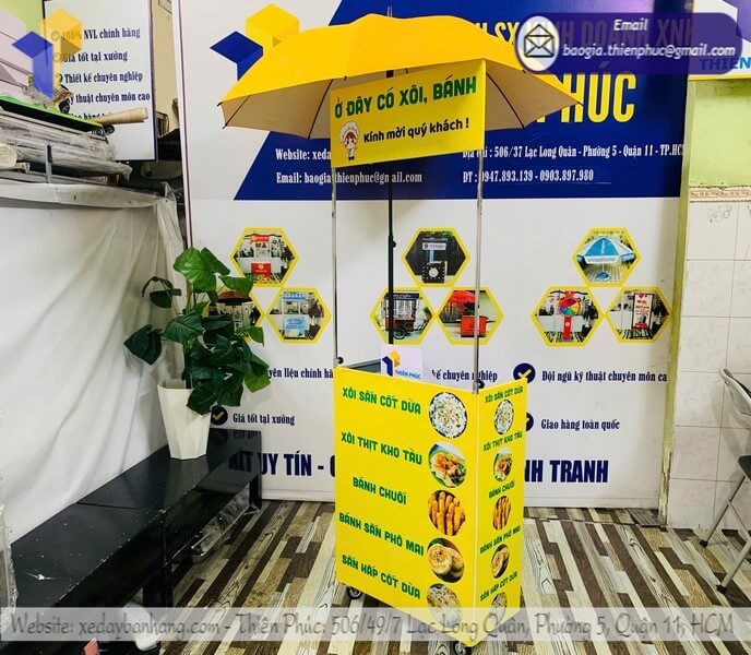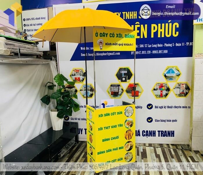 Mua mẫu quầy bán xôi xếp gọn có dù che giá rẻ - Xưởng sản xuất Thiên Phúc cung cấp nhiều mẫu quầy bán đồ ăn, nước uống lưu động kèm thêm dù che, với giá chỉ từ trên 1.000.000đ/quầy trở lên tùy mẫu mã, kích thước, thiết kế logo hoàn toàn miễn phí, liên hệ ngay để được tư vấn chi tiết và báo giá nhanh.