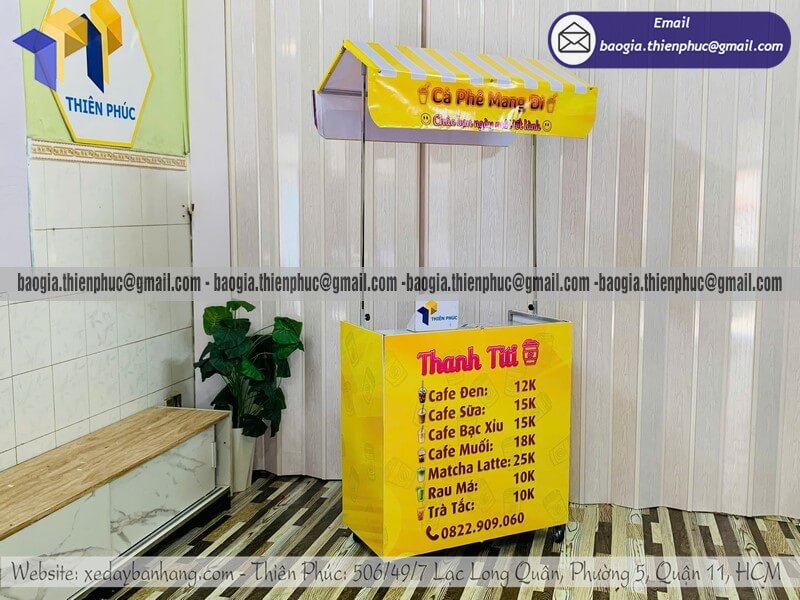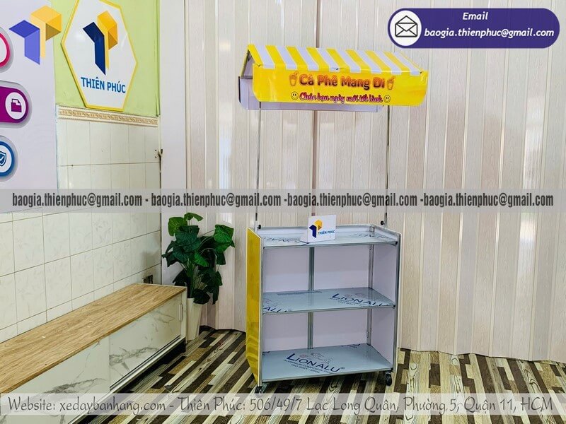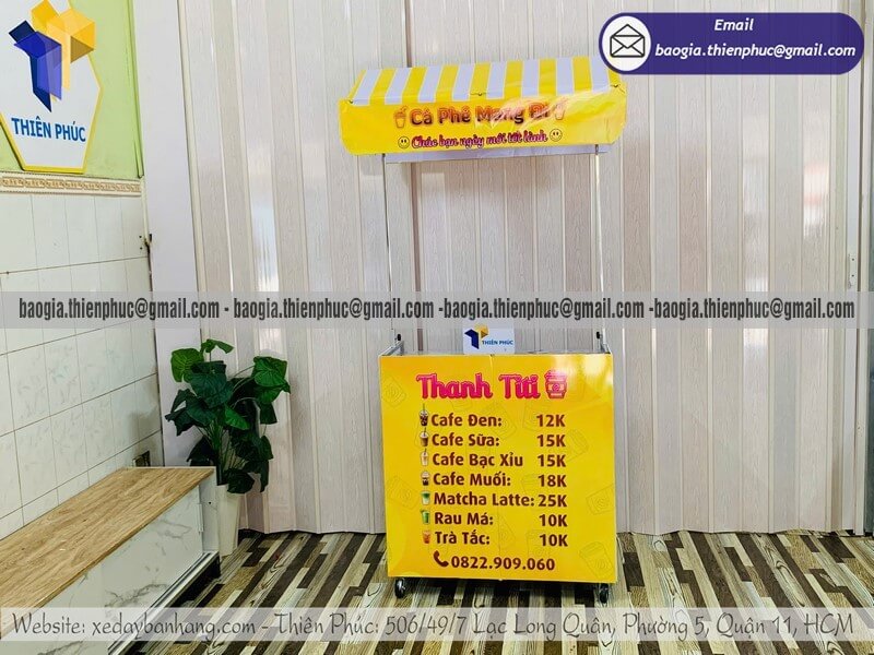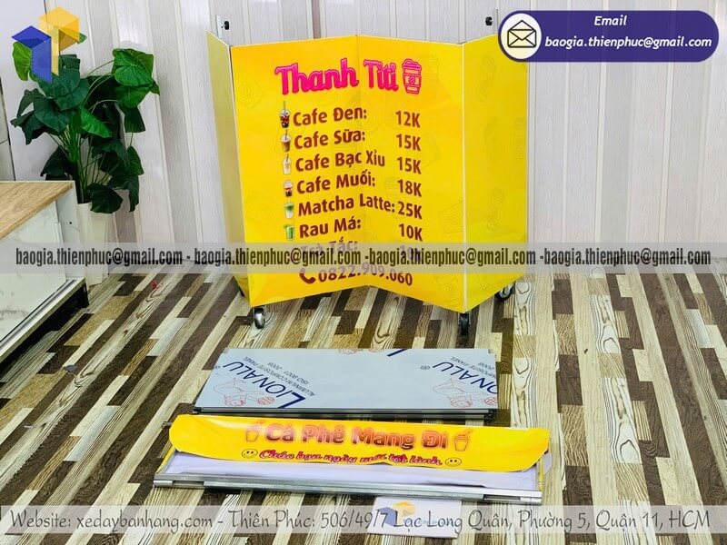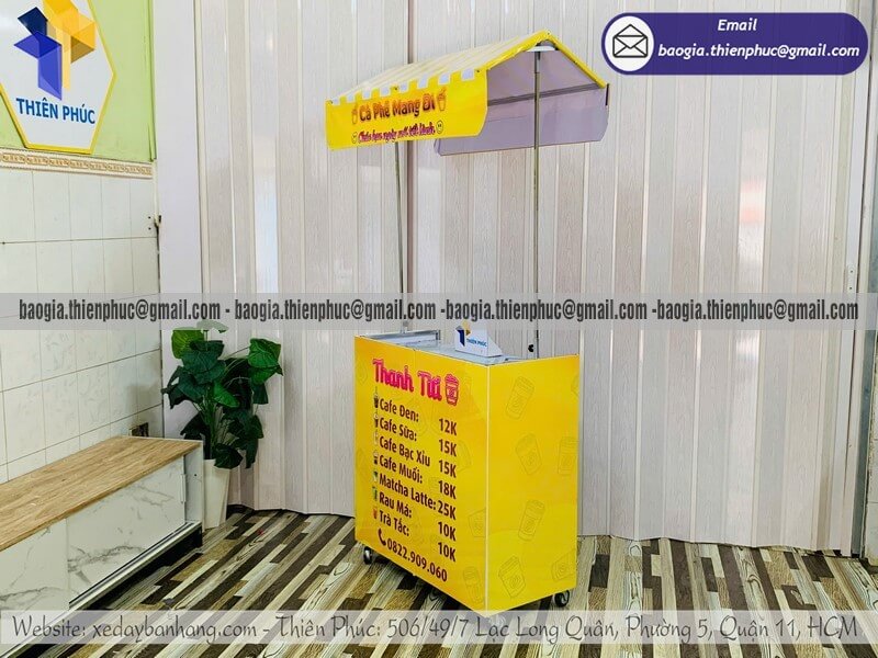 Mua quầy bán coffee nhỏ di động gấp gọn có gắn mái che - Xưởng sản xuất & Công Ty Thiên Phúc là xưởng chuyên nhận đặt làm theo yêu cầu - gia công - sản xuất - thiết kế & in ấn logo thương hiệu - nhãn hiệu - menu sản phẩm quầy bán dạo gấp gọn lưu động theo yêu cầu khách hàng với hơn 10 năm kinh nghiệm, cung cấp nhiều mẫu kệ/tủ/quầy/xe bán hàng gấp gọn lưu động, chỉ cần 700.000đ/quầy trở lên với chất lượng ốp bạt đến trên 2.200.000đ/quầy trở lên sẽ có đầy đủ kệ ly, bệ xếp,... chưa kèm theo chi phí khác như menu, ô dù,... Hỗ trợ xuất hóa đơn VAT. Đặt hàng từ 10 quầy trở lên được chiết khấu cực kỳ ưu đãi. Giao hàng nhanh trên toàn quốc. Thiết kế logo hoàn toàn miễn phí.