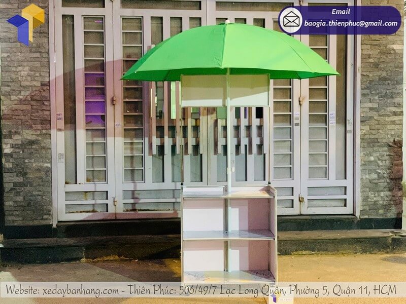Mua quầy bán đồ uống dạo gấp gọn ngoài trời có dù che - Tại xưởng sản xuất & Công Ty Thiên Phúc là nơi gia công và cung cấp mẫu quầy bán hàng gấp gọn di động/lưu động có kèm thêm dù che, giá rẻ nhất dao động từ 700.000đ/kệ trở lên đối với loại kệ ốp bạt + Dù che : 100.000đ/cây - 400.000đ/cây. Chưa kèm chi phí đi kèm khác như thêm bệ xếp, thích hợp thêm menu hoặc vòng xoay trúng thưởng. Đặt từ 10 kệ trở lên, được chiết khấu nhiều ưu đãi. Duyệt thiết kế demo hôm nay, qua hôm sau là có hàng ngay. Hãy liên hệ ngay xưởng Thiên Phúc để nhận ngay báo giá nhanh chóng hoặc đến trực tiếp ngay tại xưởng để được tư vấn mẫu mã kích thước và thiết kế. Cọc 50% đơn hàng khi đặt hàng.
