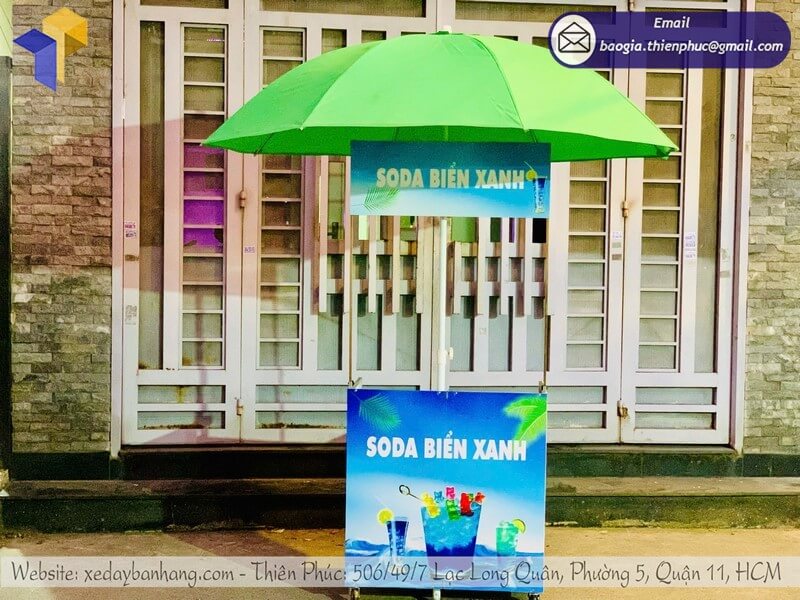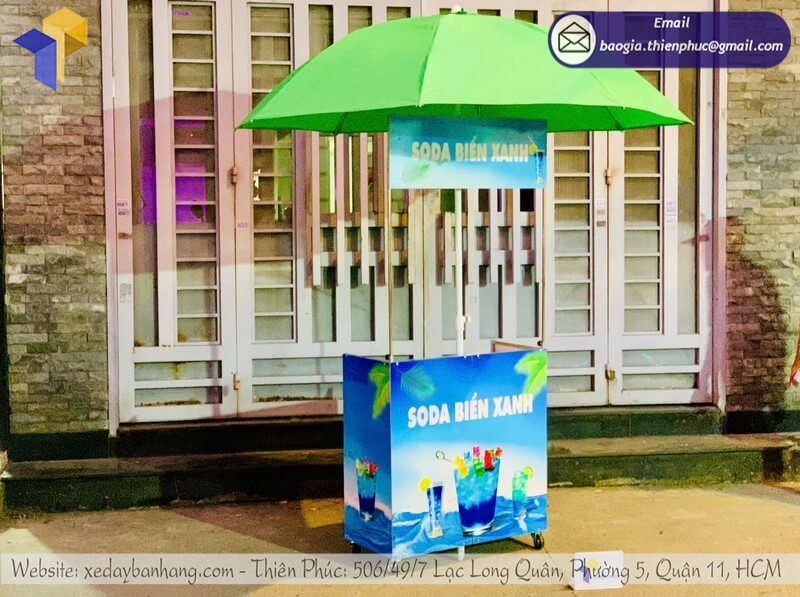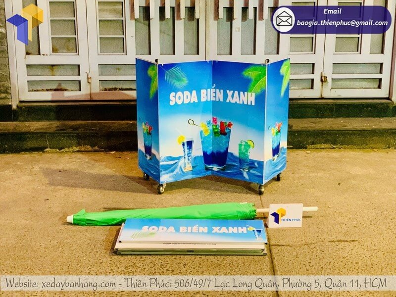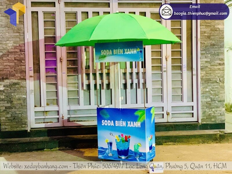 Tên sản phẩm: Mua quầy bán đồ uống dạo gấp gọn ngoài trời có dù che với logo nhãn hiệu SODA BIỂN XANH