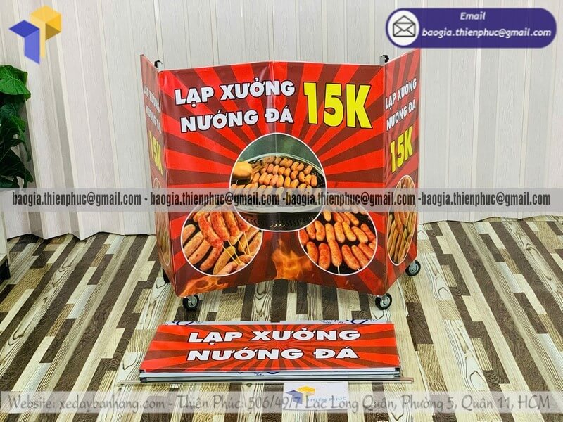 Mua quầy bán lạp xưởng nướng gấp gọn đẩy di động rẻ - Xưởng sản xuất & Công Ty Thiên Phúc là xưởng chuyên nhận đặt làm theo yêu cầu - gia công - sản xuất - thiết kế & in ấn logo thương hiệu - nhãn hiệu - menu sản phẩm tủ bán hàng rong lắp ráp lưu động theo yêu cầu khách hàng với hơn 10 năm kinh nghiệm, cung cấp nhiều mẫu kệ/tủ/quầy/xe bán hàng gấp gọn lưu động, chỉ cần 700.000đ/xe trở lên với chất lượng ốp bạt,... chưa kèm theo chi phí khác như menu, đèn led, ô dù, kệ xếp,... Hỗ trợ xuất hóa đơn VAT. Đặt hàng từ 10 tủ trở trở lên giảm mỗi kệ 50.000đ. Giao hàng nhanh trên toàn quốc. Thiết kế logo hoàn toàn miễn phí.