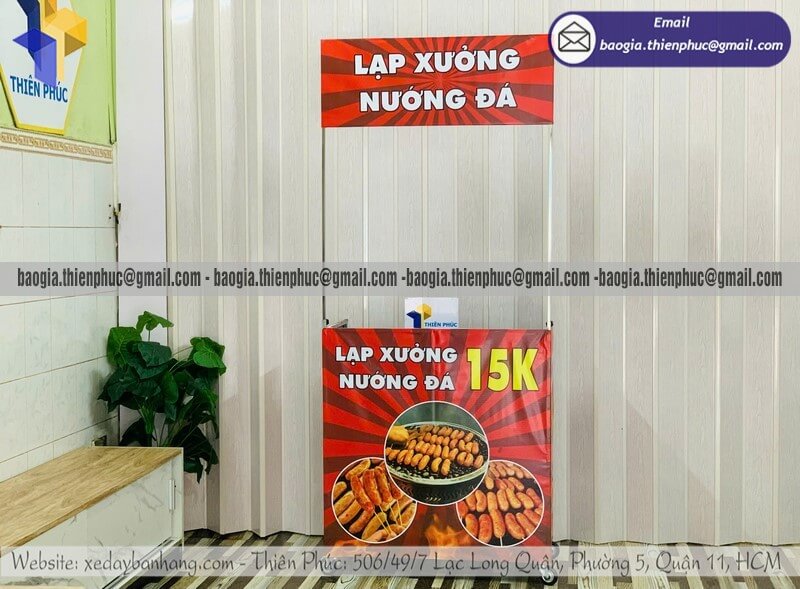 Tên sản phẩm: Mua quầy bán lạp xưởng nướng gấp gọn đẩy di động rẻ với logo decal LẠP XƯỚNG NƯỚNG ĐÁ 15K