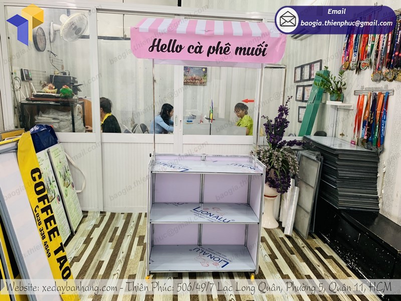 Thiên Phúc là nơi cung cấp các giải pháp thiết kế và thi công quảng cáo. Đồng thời, cũng là thương hiệu xe đẩy bán hàng được nhiều người tin dùng và sử dụng. Ngoài ra, con nhận gia công theo nhu cầu và mong muốn của khách hàng. Chúng tôi luôn đặt tiêu chí “sự hài lòng của quý khách là niềm tự hào của chúng tôi”. Tại Thiên Phúc có vô vàn mẫu mã đa dạng, giá cả phù hợp; chất lượng và uy tín trải dài khắp 64 tỉnh thành với hệ thống vận chuyển xuyên suốt 3 miền với thời gian nhanh nhất.