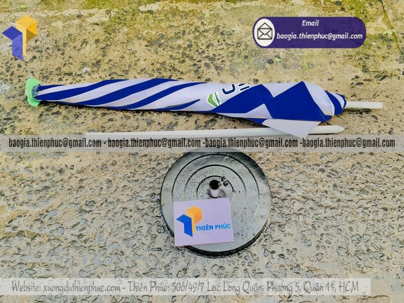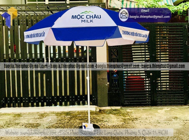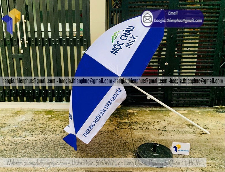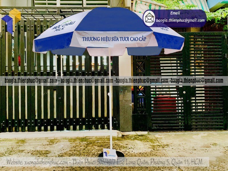 Nhận in dù quảng cáo ngoài trời che nắng cho event - Xưởng sản xuất & Công Ty Thiên Phúc chuyên cung cấp nhiều mẫu ô/dù quảng cáo tròn lớn che ngoài trời & thiết kế - in ấn logo với kích thước chủ yếu 2.2m hoặc 2.4m, 2.7m hoặc lớn hơn 3m.Với giá dao động rẻ nhất - cạnh tranh nhất thị trường chỉ riêng cây ô dù: 600.000đ - 800.000đ/cây; đế dù mua lẻ: 150.000đ/cái. Nếu mua đế cùng cây dù giảm còn 100.000đ/cái. Đặt số lượng lớn nhận ngay nhiều chiết khấu ưu đãi. Hỗ trợ xuất hóa đơn VAT đỏ cho doanh nghiệp & công ty. Liên hệ ngay xưởng Thiên Phúc nhận ngay báo giá nhanh chóng và tư vấn thiết kế logo. Giao hàng nhanh trên toàn quốc.