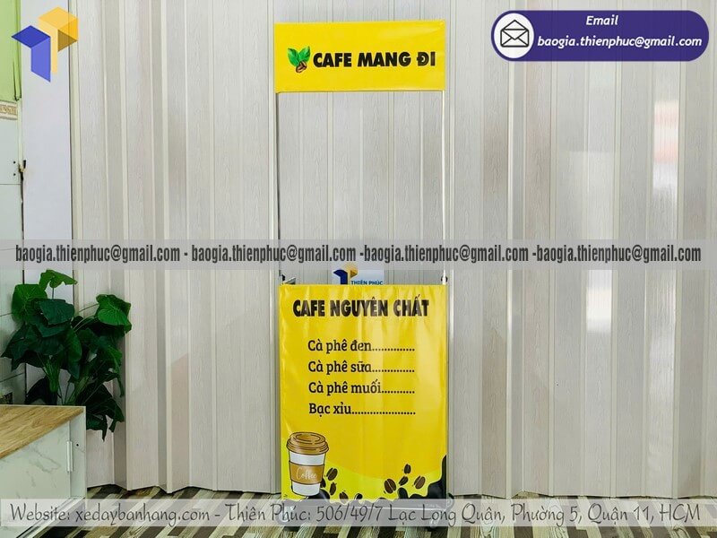 Tên sản phẩm: Nhận làm kệ bán cafe dạo mini gấp gọn lưu động vỉa hè với nhãn hiệu logo CÀ PHÊ MANG ĐI CAFE NGUYÊN CHẤT