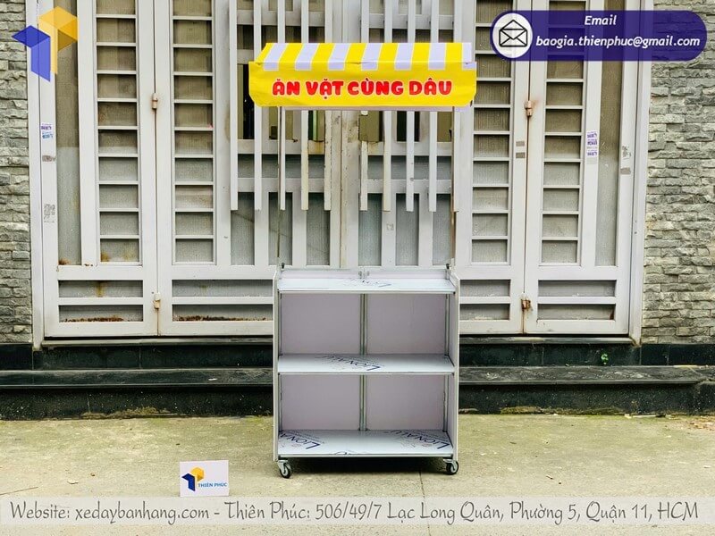 Đến trực tiếp xem mẫu, đặt hàng và tư vấn thiết kế kệ bán đồ ăn vặt dạo xếp gọn có mái che.