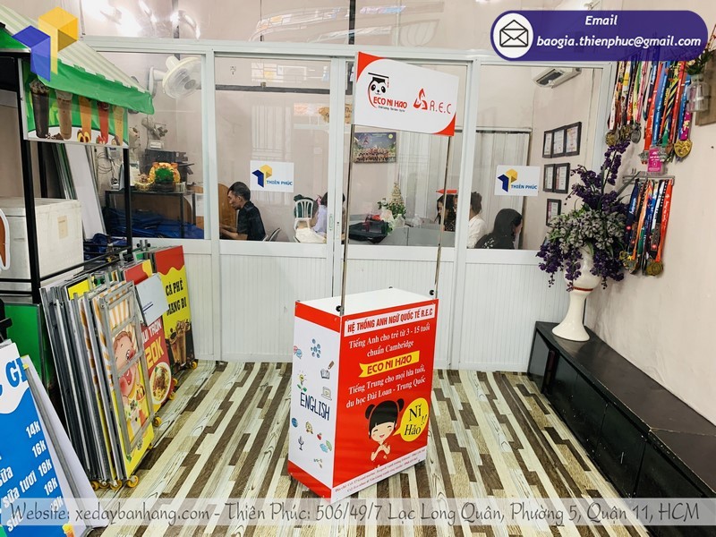 Công ty Thiên Phúc là một trong những xưởng sản xuất booth lớn nhất nhì tại Sài Gòn, chuyên nhận thi công – thiết kế trọn gói các vật phẩm quảng cáo như sản xuất booth sắt sampling giá rẻ, booth sắt sampling giá rẻ, quầy bán hàng lắp ráp lưu động từ chất liệu nhựa, sắt, inox…