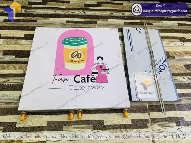 Thiên Phúc có tất cả các mẫu xe bán hàng đang bán chạy nhất trên thị trường với kích thước đa dạng từ 1m, 1m2, 1m4, 1m8, 2m. Tùy theo kích thước quầy bán café take away người dùng yêu cầu mà chúng tôi gia công vì vậy khách hàng yên tâm đặt hàng.