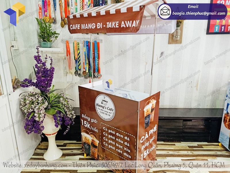 - Mái che: quầy coffee take away xếp gọn lưu động thường có mái che dạng bằng đóng vai trò quan trọng trong việc bảo vệ gian hàng của bạn dưới mọi tác động nắng mưa