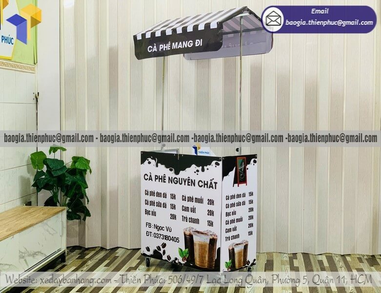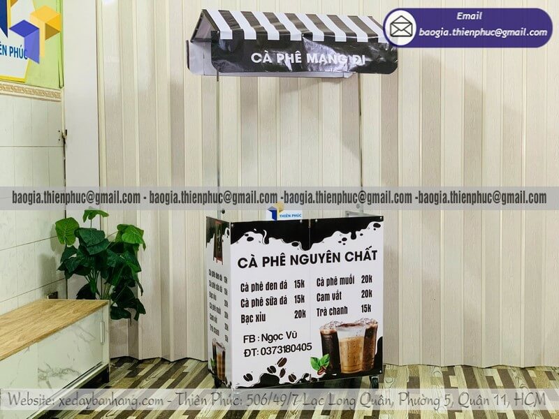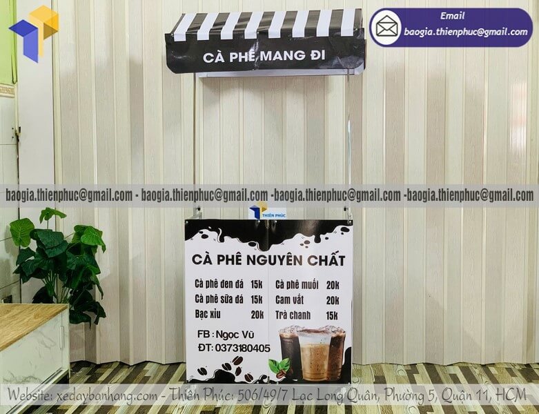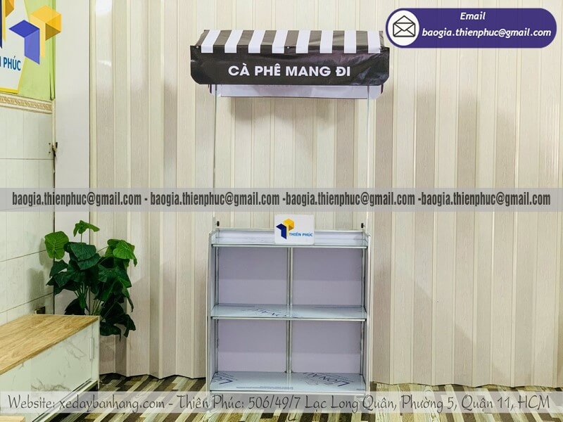 Nơi bán kệ coffee take away dạo mini di động có mái che - Xưởng sản xuất & Công Ty Thiên Phúc là xưởng chuyên nhận đặt làm theo yêu cầu - gia công - sản xuất - thiết kế & in ấn logo thương hiệu - nhãn hiệu - menu sản phẩm tủ bán hàng rong lắp ráp lưu động theo yêu cầu khách hàng với hơn 10 năm kinh nghiệm, cung cấp nhiều mẫu kệ/tủ/quầy/xe bán hàng gấp gọn lưu động, chỉ cần 700.000đ/xe trở lên với chất lượng ốp bạt,... chưa kèm theo chi phí khác như menu, đèn led, ô dù, kệ xếp,... Hỗ trợ xuất hóa đơn VAT. Đặt hàng từ 10 tủ trở trở lên giảm mỗi kệ 50.000đ. Giao hàng nhanh trên toàn quốc. Thiết kế logo hoàn toàn miễn phí.