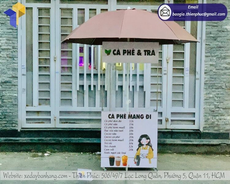 - "Quầy cafe di động Thiên Phúc rất tiện lợi, dù che chắc chắn, giúp tôi bán cafe ngoài trời mùa hè mà không lo nắng nóng." – Anh Nam, TP.HCM