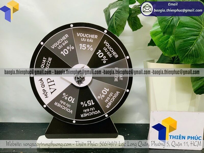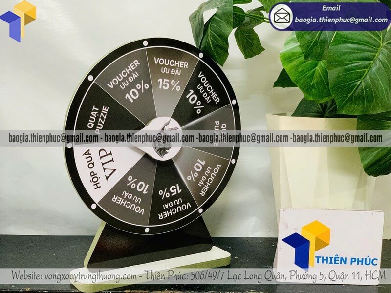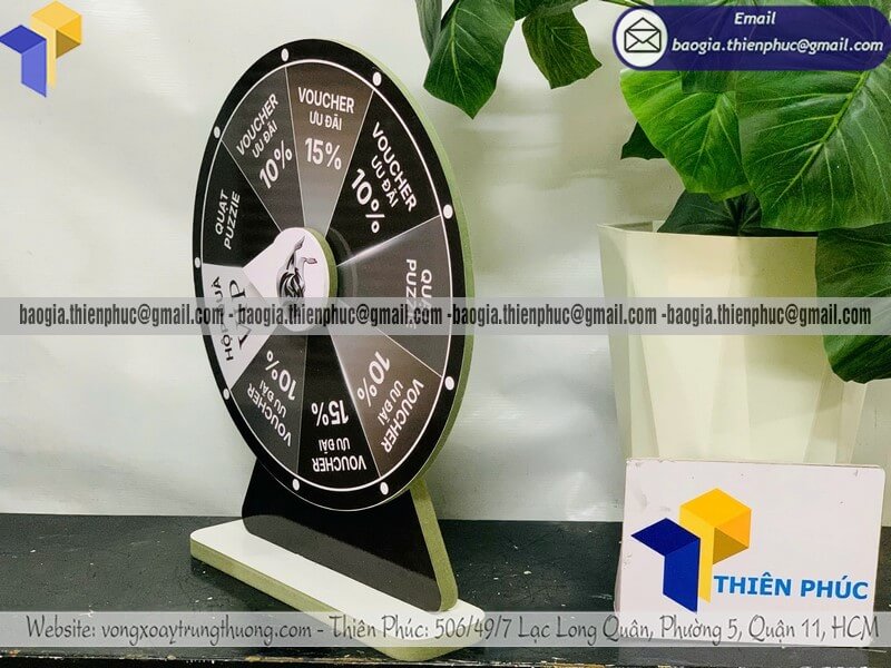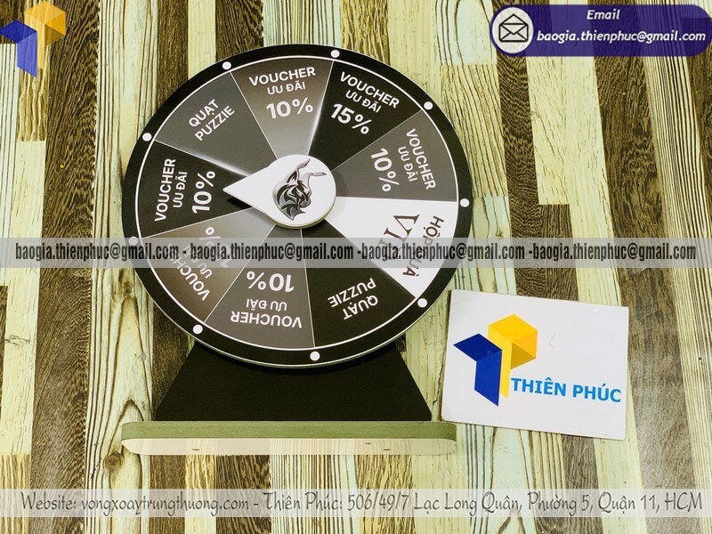 Ngoài các mẫu trên, xưởng sản xuất Thiên Phúc còn nhận gia công vòng xoay trúng quà theo yêu cầu, tùy chỉnh kích thước, số ô quay, màu sắc, logo và nội dung giải thưởng, đáp ứng đầy đủ nhu cầu từ khách lẻ đến đơn hàng số lượng lớn.