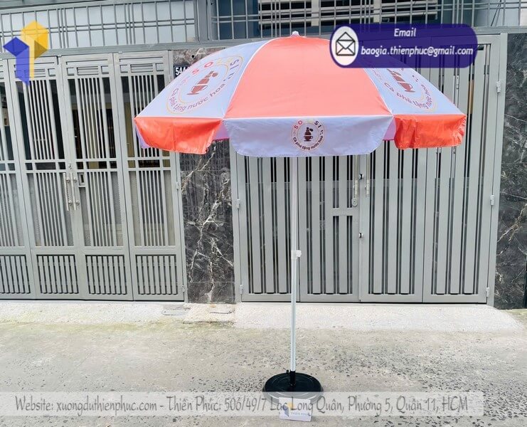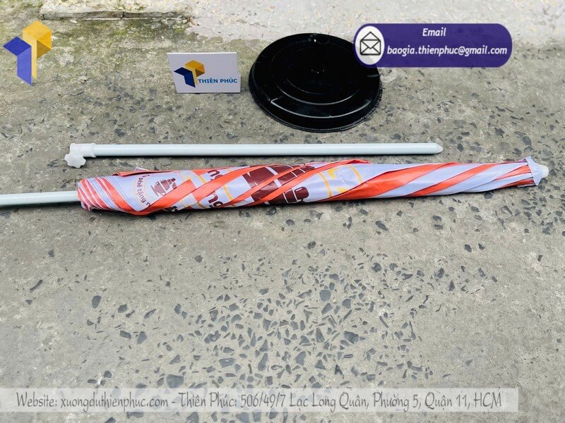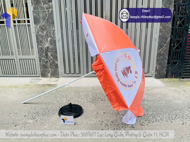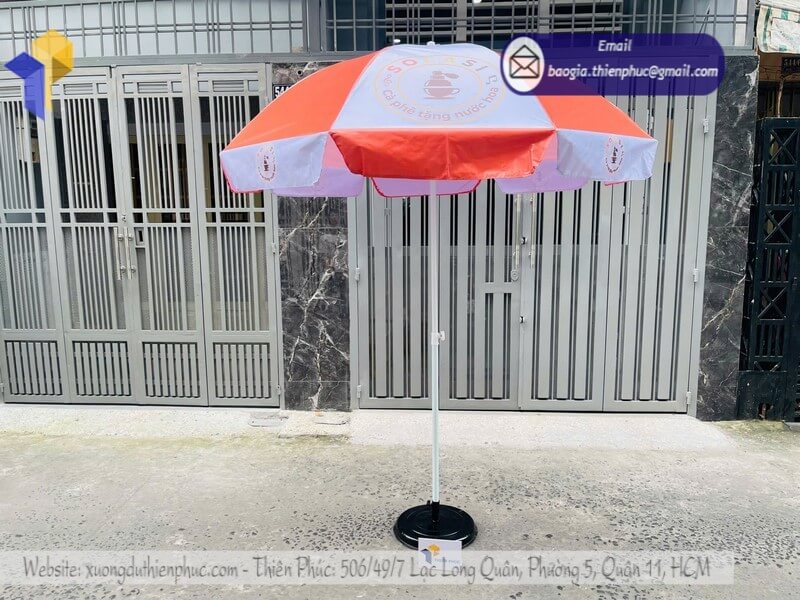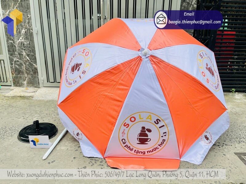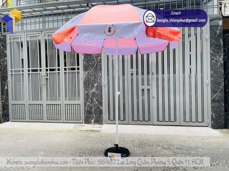 Nơi cung cấp dù tròn che quảng cáo ngoài trời in logo - Xưởng sản xuất Thiên Phúc là nơi cung cấp và thiết kế in ấn logo ô dù tròn quảng cáo cho doanh nghiệp. Giá dao động rẻ nhất chỉ từ 600.000đ/cây - 800.000đ/cây chưa bao gồm đế dù. Khi mua lẻ đế dù: 150.000đ/cái. Liên hệ Thiên Phúc hoặc đến ngay tận xưởng để được tư vấn và báo giá chi tiết nhất về thiết kế cũng như giá cả.