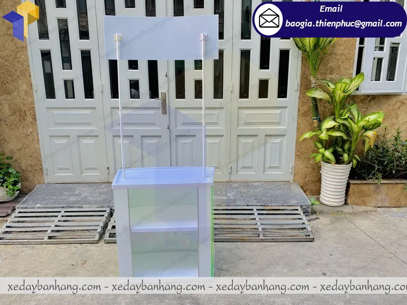 + Hai cây chống nối với logo và phần quầy bằng thép ống sơn trắng