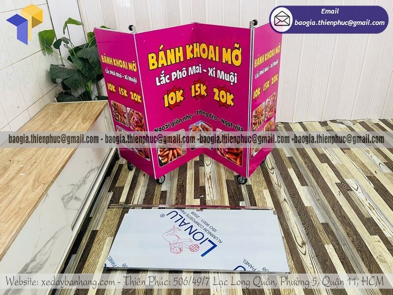 Nơi mua quầy bán bánh hàng rong xếp gọn mang đi - Xưởng sản xuất & Công Ty Thiên Phúc là xưởng chuyên nhận đặt làm theo yêu cầu, gia công, sản xuất, thiết kế & in ấn logo thương hiệu, nhãn hiệu, menu sản phẩm quầy bán dạo gấp gọn lưu động theo yêu cầu khách hàng với hơn 10 năm kinh nghiệm, cung cấp nhiều mẫu kệ/tủ/quầy/xe bán hàng gấp gọn di động, chỉ cần 700.000đ/quầy trở lên với chất lượng ốp bạt đến trên 2.200.000đ/quầy trở lên sẽ có đầy đủ kệ ly, bệ xếp,... chưa kèm theo chi phí khác như bảng menu, ô dù che, kệ ly, bệ xếp phụ... Hỗ trợ xuất hóa đơn VAT. Đặt hàng từ 10 quầy trở lên được chiết khấu cực kỳ ưu đãi. Giao hàng nhanh trên toàn quốc trong vòng 2-3 ngày hoặc khách đến ngay tại xưởng lấy hàng. Thiết kế logo hoàn toàn miễn phí. Tặng kèm thêm 1 hashtag cầm tay.