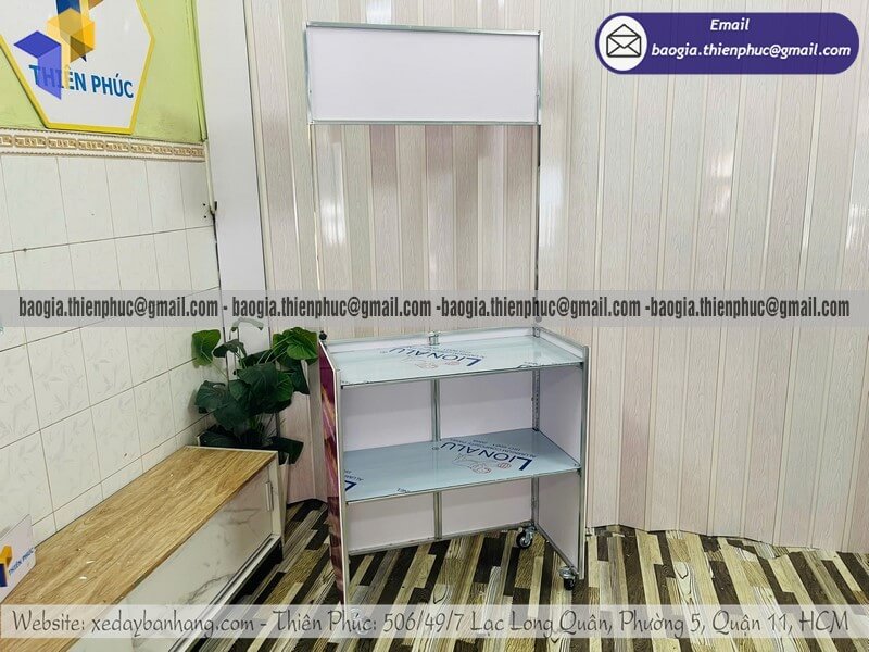 Chọn quầy có in logo + màu sắc nổi bật + bánh xe di chuyển