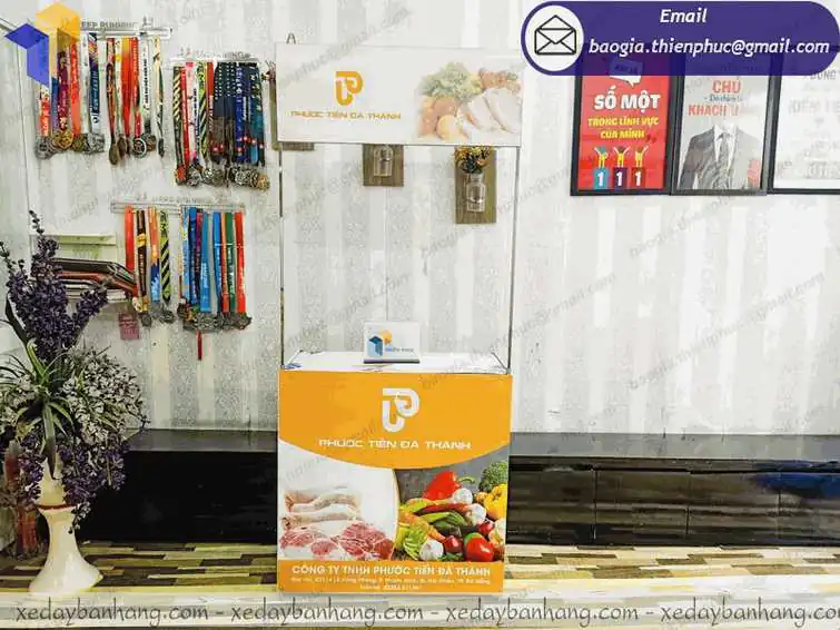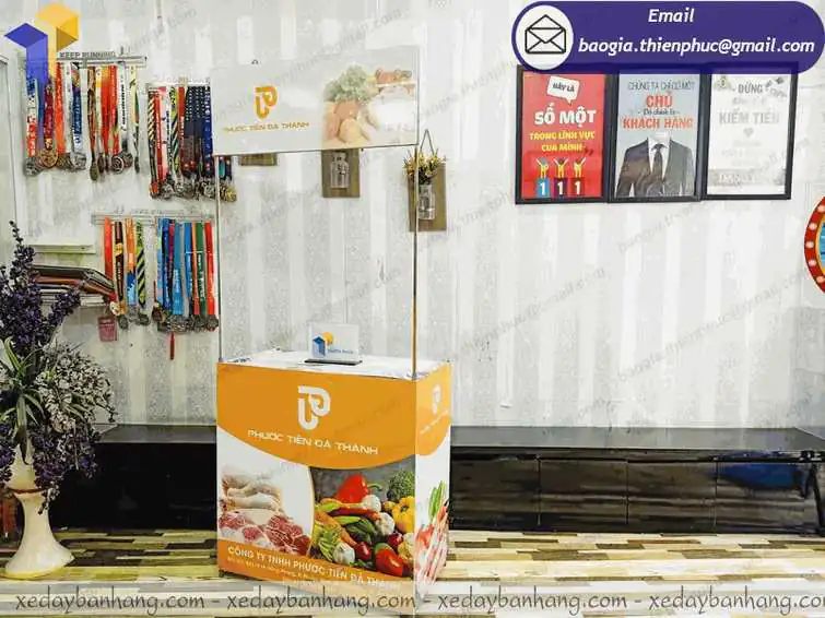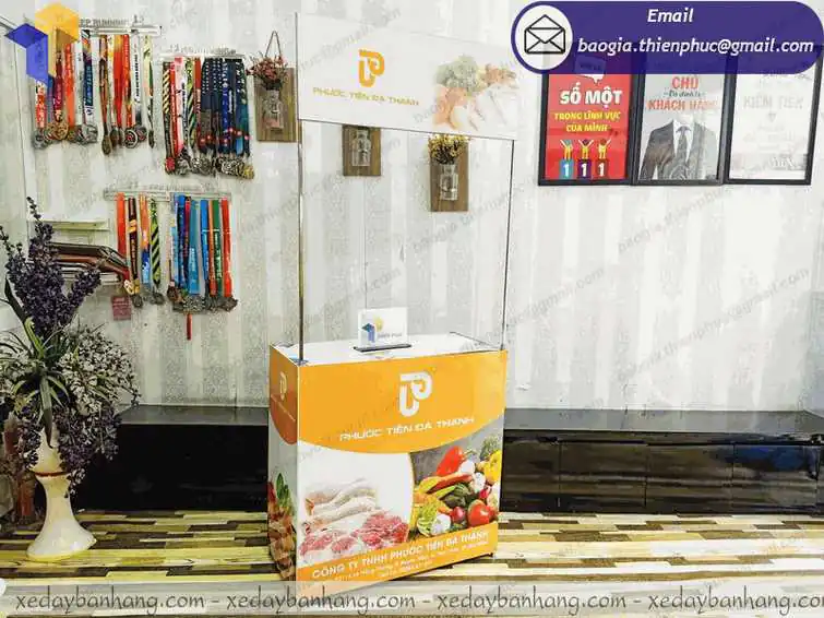 - Phần decal của chiếc booth samling giá rẻ được thiết kế và in ấn tùy theo yêu cầu của khách hàng dưới sự hỗ trợ của đội ngũ thiết kế của Thiên Phúc. Để hạn chế bị phai màu chúng tôi sử dụng mực in và decal cao cấp vừa thể hiện rõ được logo thương hiệu, slogan vừa tạo điểm nhấn cho khách hàng.