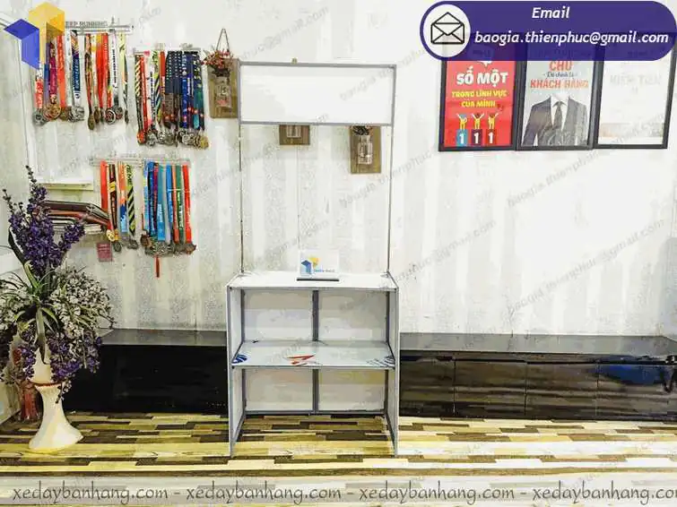 - Phần khung booth: Đây là bộ phận quyết định đến độ bền và chắc chắn của chiếc booth quảng cáo. Nên tại Thiên Phúc chúng tôi rất chú trọng đến vật liệu làm khung của quầy, chúng tôi sử dụng loại sắt mạ kẽm chống rỉ sét cao cấp nhất hiện nay nhằm gia tăng độ bền của booth.