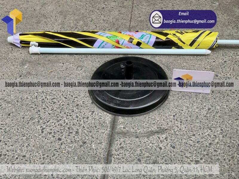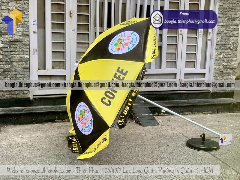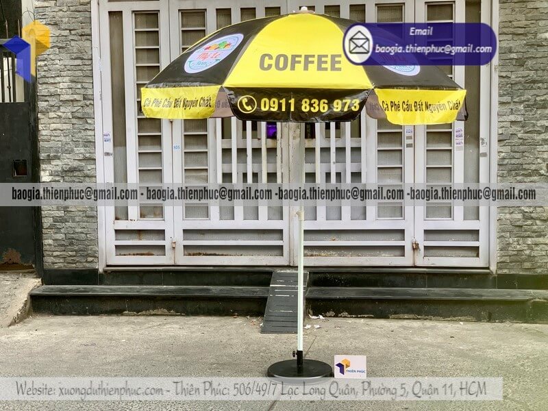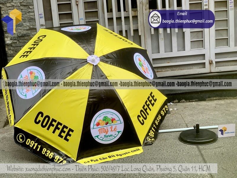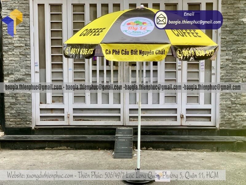 Nơi thiết kế dù tròn quảng cáo cỡ lớn ngoài trời đẹp - Xưởng sản xuất & Công Ty Thiên Phúc chuyên cung cấp nhiều mẫu ô/dù quảng cáo tròn lớn che ngoài trời & thiết kế - in ấn logo với kích thước chủ yếu 2.2m hoặc 2.4m hoặc lớn hơn 3m.Với giá dao động rẻ nhất - cạnh tranh nhất thị trường chỉ riêng cây ô dù: 600.000đ - 800.000đ/cây; đế dù mua lẻ: 150.000đ/cái. Nếu mua đế cùng cây dù giảm còn 100.000đ/cái. Đặt số lượng lớn nhận ngay nhiều chiết khấu ưu đãi. Hỗ trợ xuất hóa đơn VAT đỏ cho doanh nghiệp & công ty. Liên hệ ngay xưởng Thiên Phúc nhận ngay báo giá nhanh chóng và tư vấn thiết kế logo. Giao hàng nhanh trên toàn quốc.