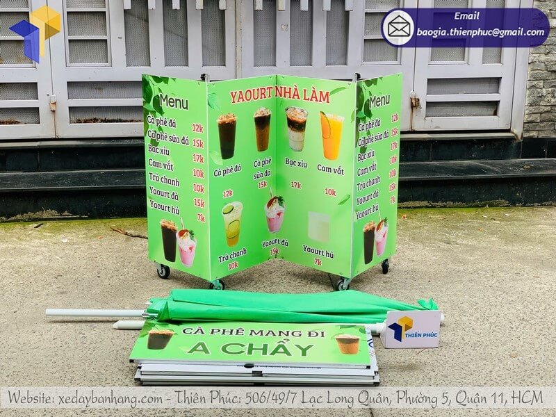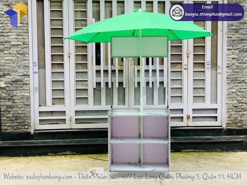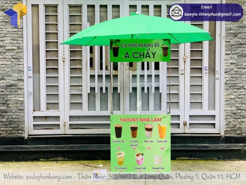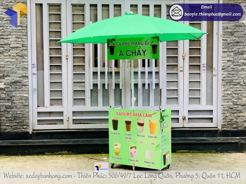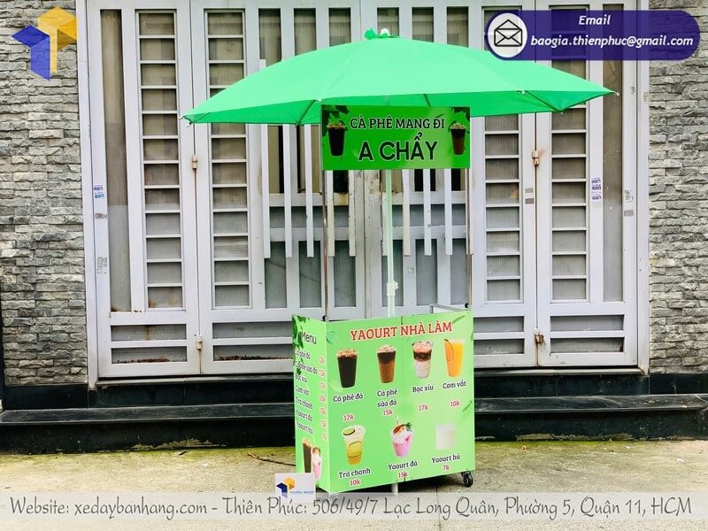 Quầy bán cafe take away xếp gọn có dù che - Thiên Phúc chuyên sản xuất và gia công mẫu quầy xe với trên 10 năm, thiết kế in ấn hoàn toàn miễn phí, cam kết giá rẻ tận xưởng.