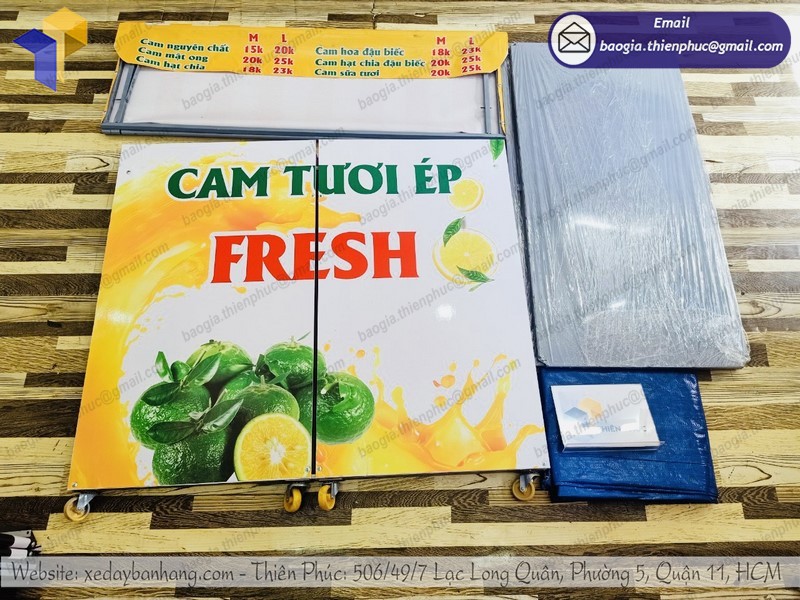 + Mẫu mã nổi bật: quầy bán nước cam Thiên Phúc có kiểu dáng, mẫu mã đẹp mắt bởi nó được trang trí bởi những tấm decal đầy màu sác, hình ảnh sinh động, hấp dẫn.