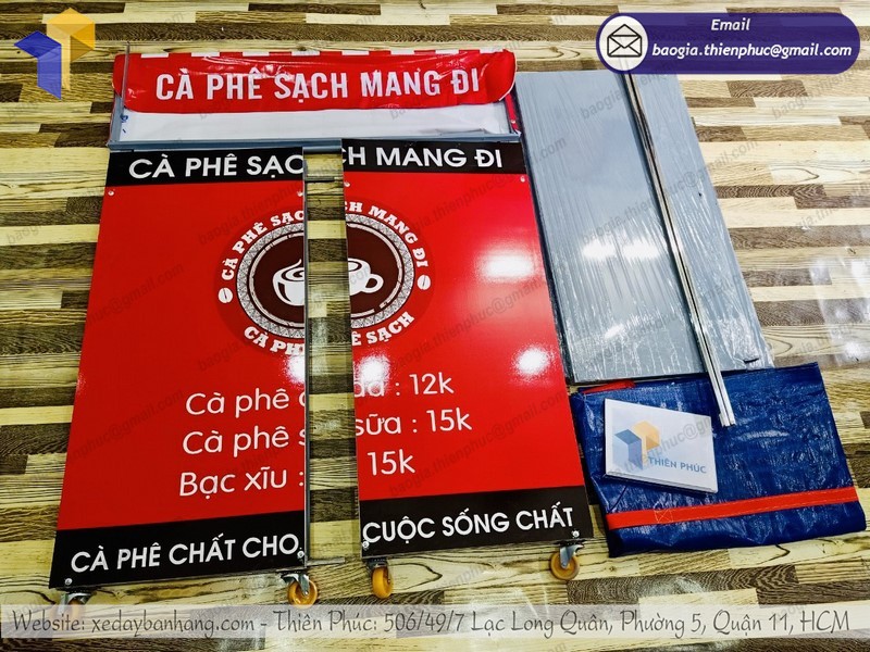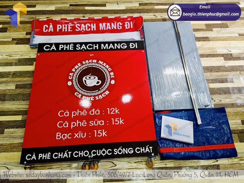 Quầy cà phê sạch giá rẻ mang đi được Thiên Phúc chúng tôi sản xuất từ chất liệu khung sắt hộp sơn mạ kẽm chống gỉ sét, xung quanh phần xe lắp ráp được cán decal, hai thanh chống được làm bằng inox, in hình ảnh thiết kế và in 3D sắc nét, thu hút ánh nhìn của khách hàng từ xa. Với tiện ích có thể thực hiện gấp gọn, thuận tiện trong việc di chuyển, xe lắp ráp bán café mang đi rẻ đẹp ngày càng được nhiều khách hàng ưa chuộng và tin tưởng sử dụng