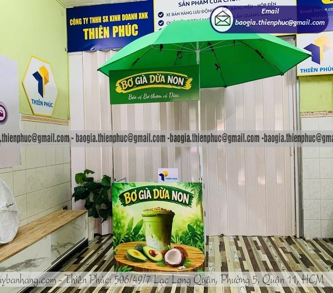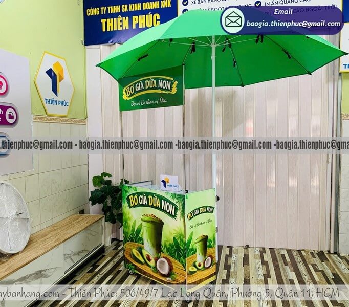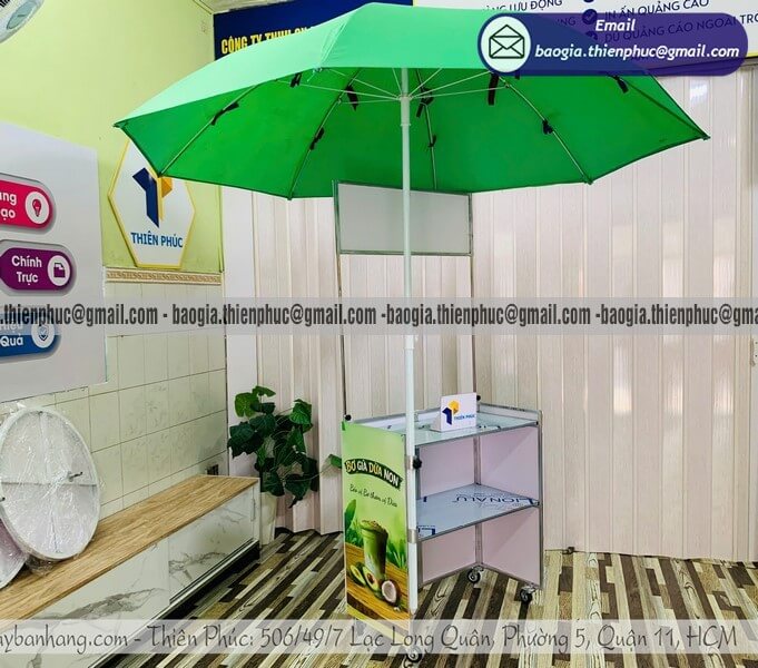 Điểm nhấn của bộ sản phẩm chính là chiếc dù quảng cáo đi kèm. Dù được thiết kế có lỗ cắm trực tiếp vào thân quầy hoặc đứng cạnh với chân đế chắc chắn. Tán dù rộng từ 2m đến 2m4 không chỉ che nắng mưa mà còn là vị trí đắc địa để in ấn logo, giúp khách hàng nhận ra quầy kinh doanh đồ uống của bạn từ khoảng cách hàng trăm mét.