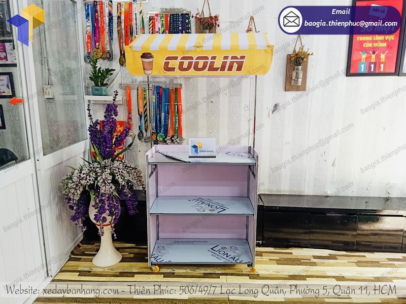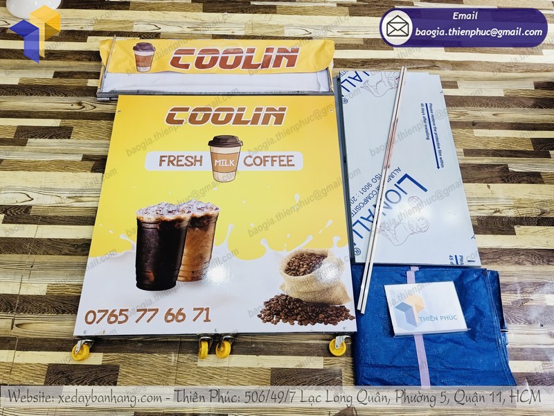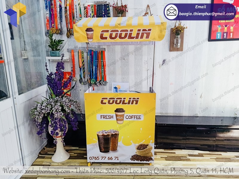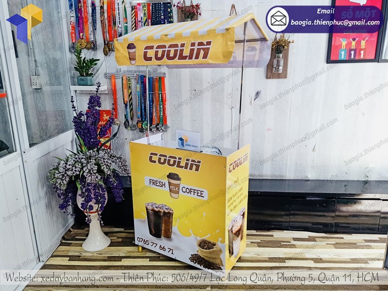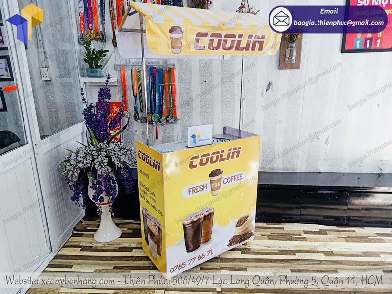 Những chiếc xe đẩy thông thường không có sẵn mái che. Để có mái che bạn có thể sử dụng những tấp bạt bằng nilong để che chắn. Nhưng mái che bằng nilong không đẹp và thẩm mỹ. Bạn có thể sáng tạo bằng cách làm mái hiên cho xe đẩy của quán. Đa phần, hiện nay nhiều xưởng sản xuất đều có gia công và thiết kế mái hiên theo nhu cầu của người bán. Thiên Phúc cũng là nơi nhận gia công mái hiên cho quầy xếp bán coffee. Không những thế có rất nhiều ưu đãi khi khách hàng mua hàng tại Thiên Phúc
