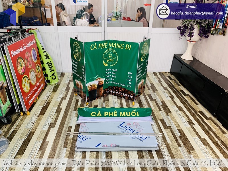 Xe bán café xếp m thực sự trở nên hữu ích với nhiều doanh nghiệp cũng như tổ chức và đặc biệt hơn hết là các nhãn hiệu hoặc doanh nghiệp quảng cáo. Bằng chất liệu sắt mạ kẽm 100% có thể tháo lắp dễ dàng và trưng bày tại các siêu thị hoặc các gian hàng, hội chợ,triển lãm hoặc tại các vỉa hè ngã ba đông người qua lại… xe café mang đi gấp gọn với kích thước tiêu chuẩn dễ dàng trưng bày và giới thiệu sản phẩm của doanh nghiệp trực tiếp lên booth với trọng lượng tiêu chuẩn nặng 20 đến 25kg có thể vận chuyển lưu động đi xa được. Sử dụng khá đơn giản không cồng kềnh khi tháo và lắp giúp người sử dụng có thể lắp và ráp một cách dễ dàng.