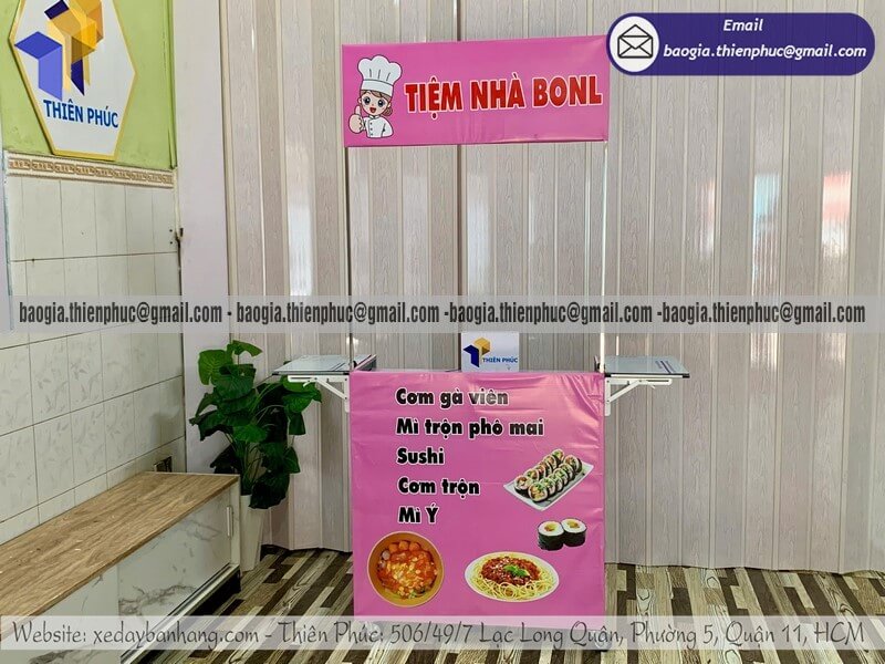 Tại xưởng sản xuất và Công Ty THIÊN PHÚC, ngoài mẫu quầy bán mì trộn nhỏ gấp gọn ngoài trời, chúng tôi còn chuyên nhận thiết kế – gia công – sản xuất – in ấn logo decal theo yêu cầu với nhiều dòng quầy bán hàng nhỏ gấp gọn, phù hợp cho mọi mô hình kinh doanh từ cá nhân đến doanh nghiệp.