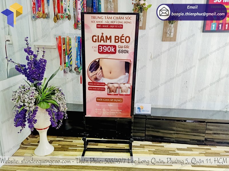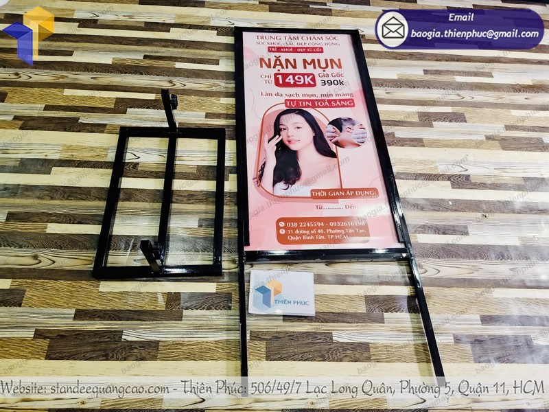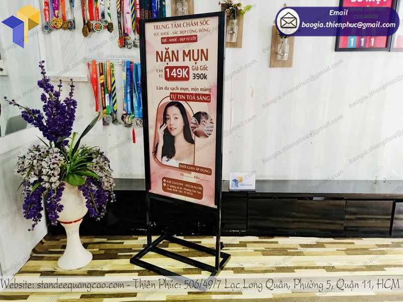 - Thiên Phúc sẽ hướng dẫn cho bạn lựa chọn và phân biệt loại standee đế sắt hai mặt thường và loại chân cường lực để có chi phí làm rẻ nhất.