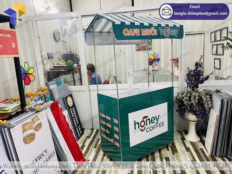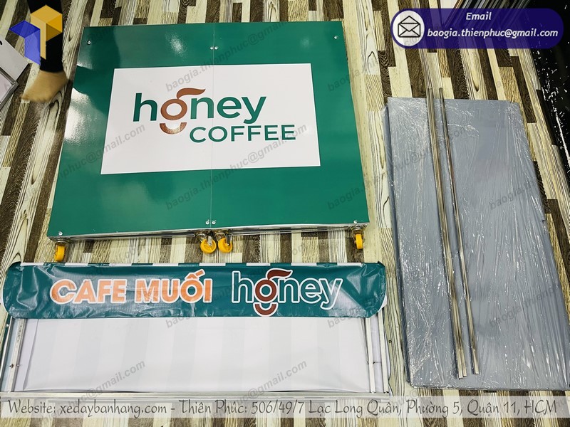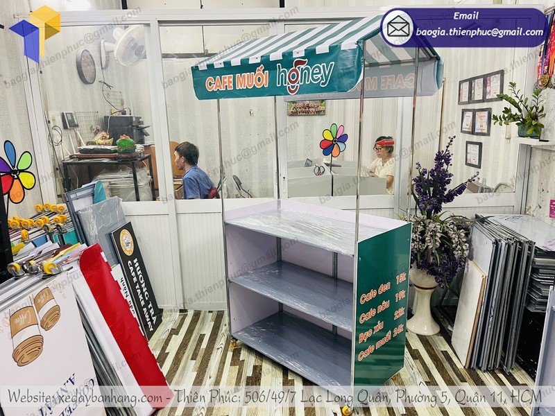 - Khung làm từ sắt vuông 20cm. Phía trong có 2 ngăn, 1 ngăn tôn và 1 ngăn sắt rỗng. Phần mái có thể làm logo bắn bạt hoặc mái bạt để tạo thêm bóng mát cho xe tháo ráp cafe lưu động. Tất cả các chi tiết sau khi gấp gọn sẽ nằm bên trong quầy để quầy trở nên gọn hơn khi di chuyển.