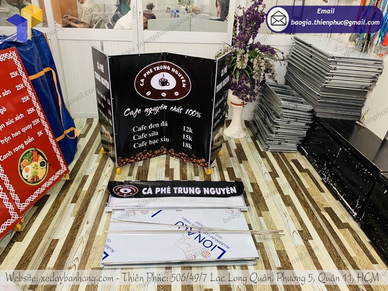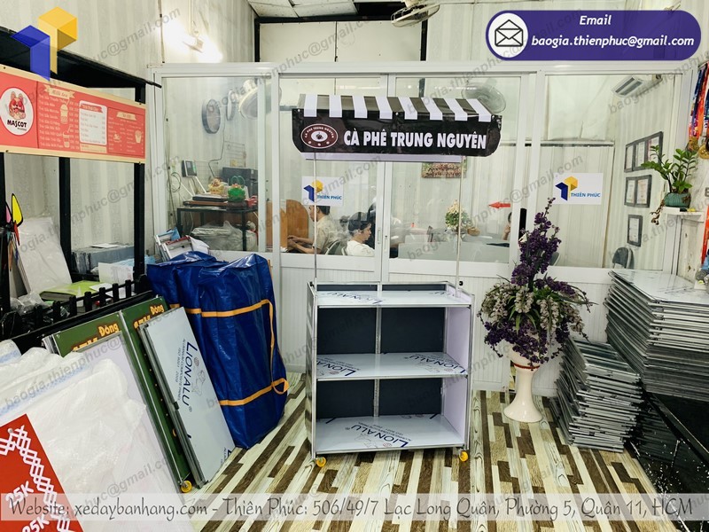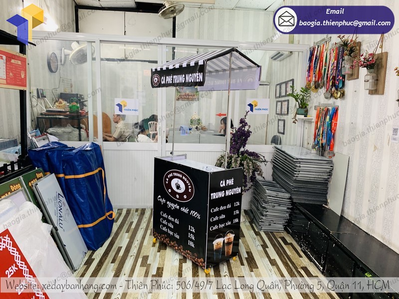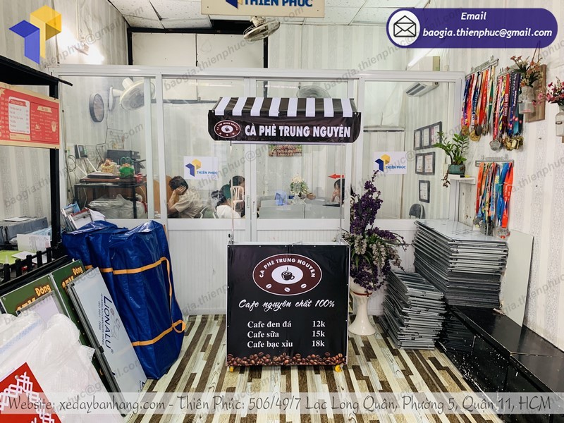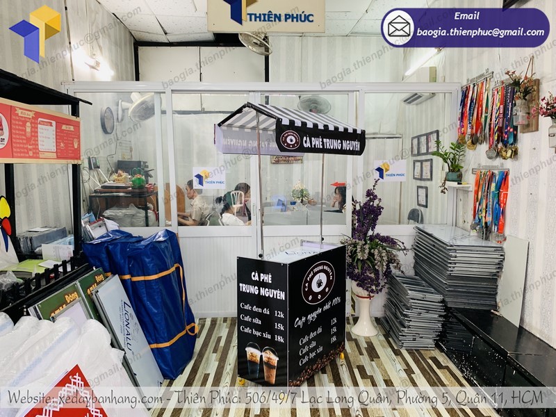Công ty thiết kế và thi công quảng cáo Thiên Phúc chuyên sản xuất và phân phối xe lắp ráp bán cà phê lưu động với nhiều mẫu mã đẹp mắt. Ngoài xe đẩy, còn có kiot bán hàng, xe đạp bán hàng lưu động, quầy xe lắp ráp và phụ kiện quảng cáo, tủ kiếng,..