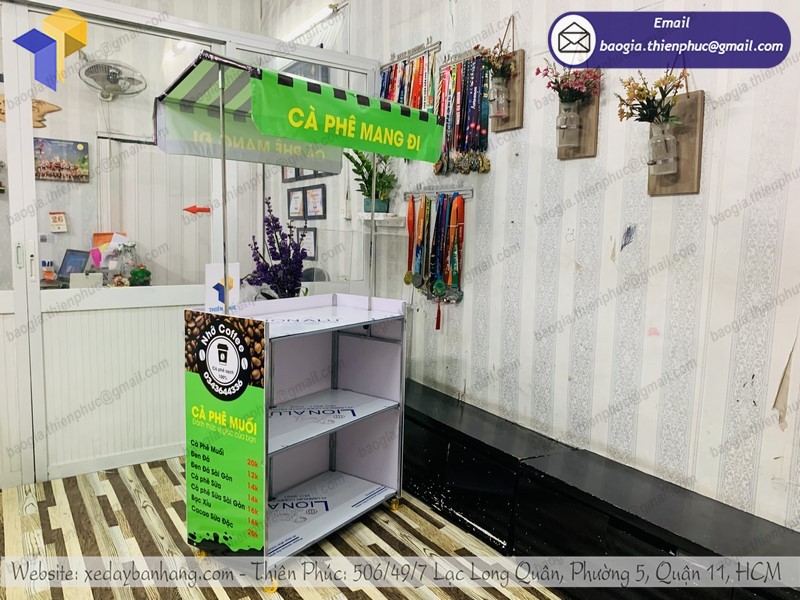 Xe bán hàng lắp ráp bán cà phê của Thiên Phúc chúng tôi được làm từ khung sắt, mặt bàn nhôm hoặc alu rất chắc chắn, thời gian sử dụng lâu bền, chịu được trọng lượng lên đền 20 - 25kg.