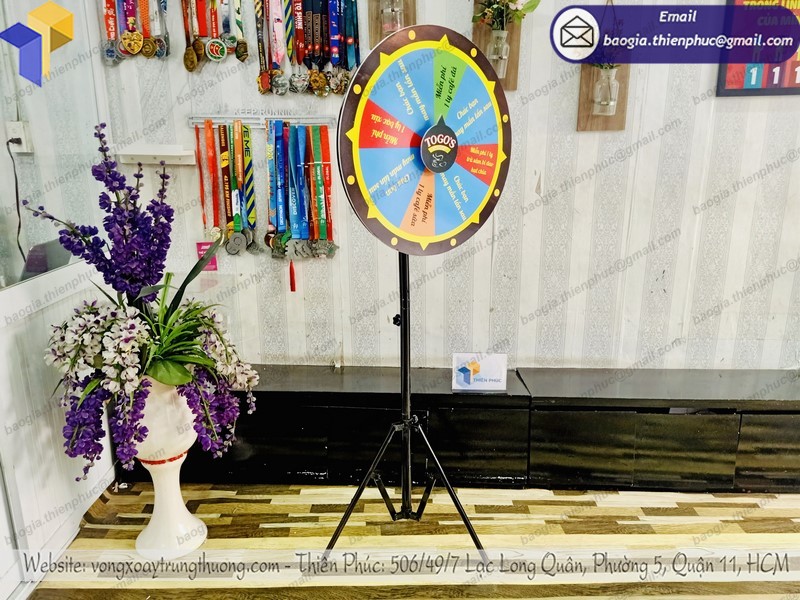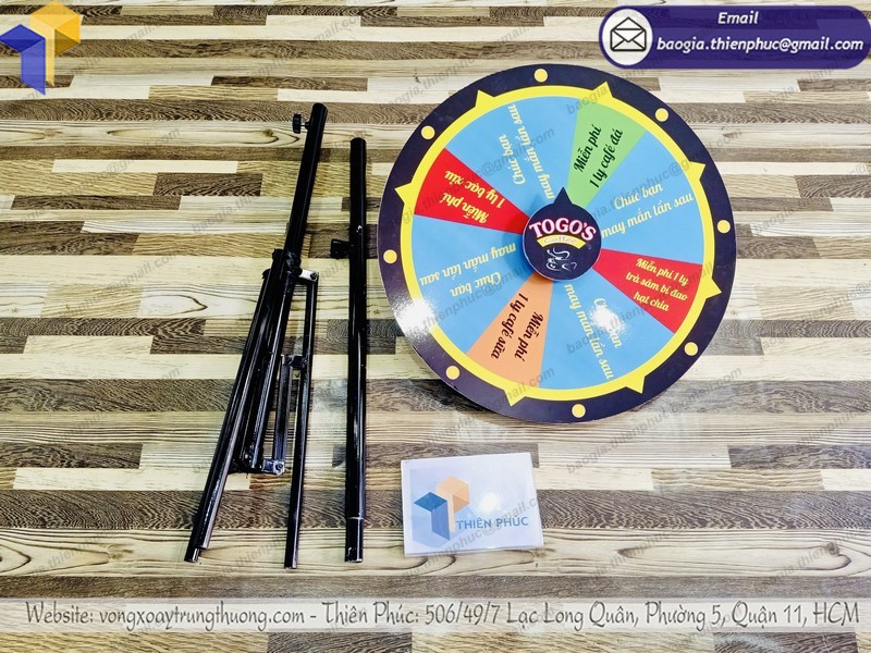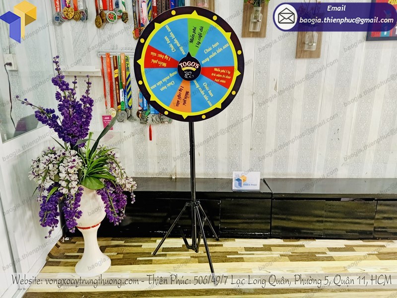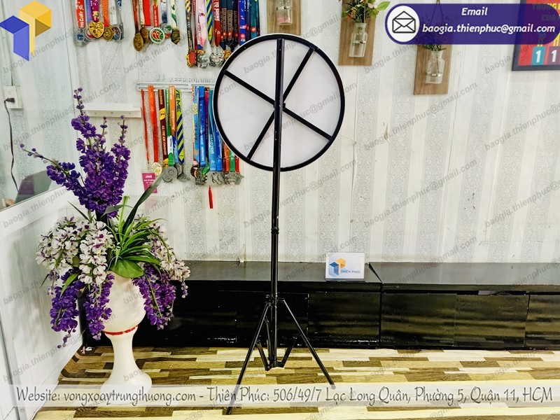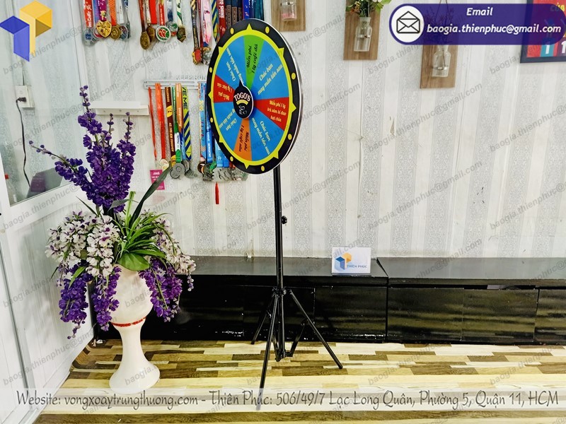 Vòng quay thưởng hay còn gọi là vòng quay may mắn với hình ảnh tùy chỉnh được với kích thước có thể tùy chỉnh về cả chiều cao lẫn đường kính vòng quay. Với sản phẩm này của công ty Thiên Phúc bạn có trong tay một công cụ dễ thu gọn, dễ mang vác, chi phí rẻ trong khi hiệu quả quảng cáo lại cao.