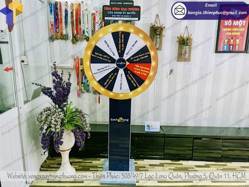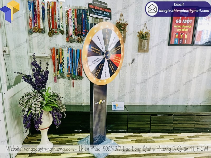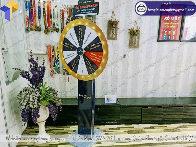 Với ưu thế có xưởng sản xuất độc lập công ty chúng tôi nhận cung cấp vòng xoay trúng thưởng từ khâu lấy ý tưởng thiết kế từ khách hàng đến sản xuất hoàn thiện sản phẩm với giá cả hợp lí. Quý doanh nghiệp có nhu cầu về làm vòng xoay trúng thưởng hãy liên hệ ngay đến hotline 0903.897.980 công ty chúng tôi sẽ được tư vấn tận tình miễn phí.