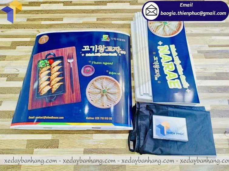 + Phần tấm logo phía trên là 0.3×0.8m chất liệu decal ngoài trời, cắt sát để cán bồi lên bề mặt bàn và tấm logo