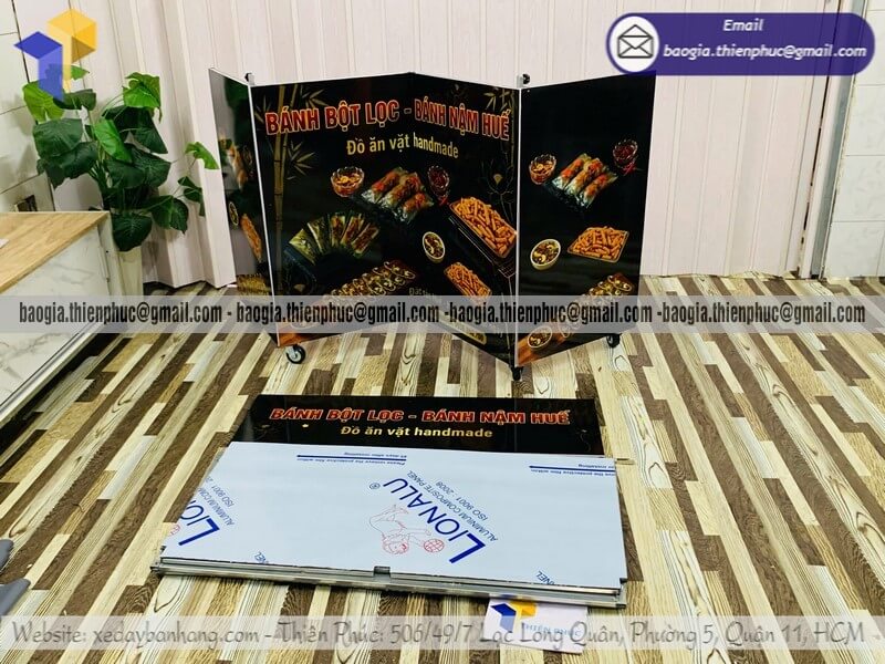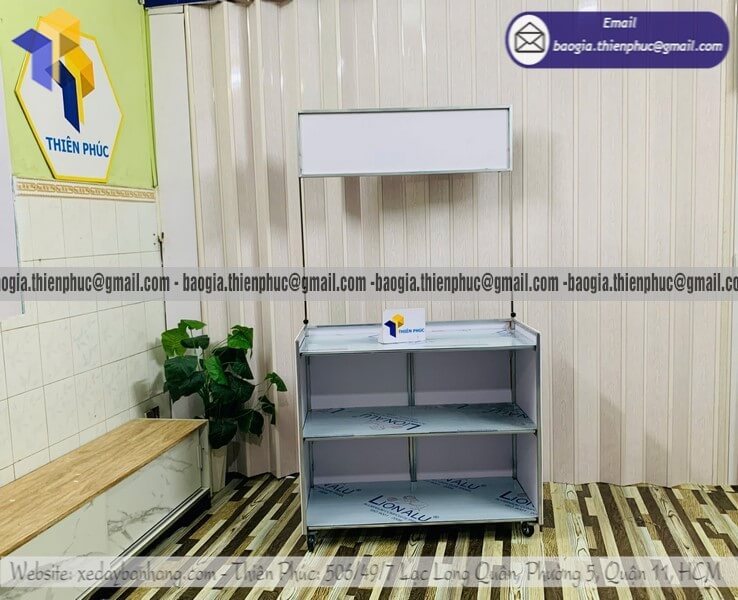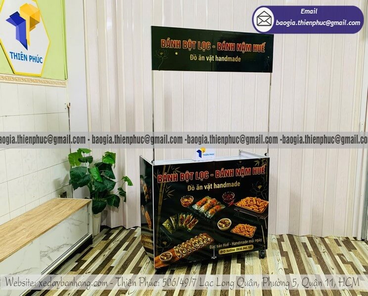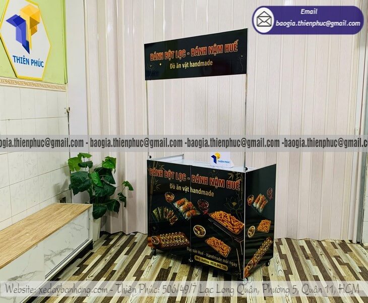 Thiết kế kệ bán bánh dạo xếp gọn lắp ráp trên hè phố - Xưởng sản xuất & Công Ty Thiên Phúc là xưởng chuyên nhận đặt làm theo yêu cầu, gia công, sản xuất, thiết kế & in ấn logo thương hiệu - nhãn hiệu - bảng menu sản phẩm quầy bán dạo gấp gọn lưu động theo yêu cầu khách hàng với hơn 10 năm kinh nghiệm, cung cấp nhiều mẫu kệ/tủ/quầy/xe bán hàng gấp gọn lưu động, chỉ cần 700.000đ/kệ trở lên với chất lượng ốp bạt đến trên 2.200.000đ/kệ trở lên sẽ có đầy đủ kệ ly, bệ xếp,... chưa kèm theo chi phí khác như menu, ô dù,... Hỗ trợ xuất hóa đơn VAT. Đặt hàng từ 10 KỆ trở lên được chiết khấu cực kỳ ưu đãi. Giao hàng nhanh trên toàn quốc. Thiết kế logo hoàn toàn miễn phí. Tặng kèm thêm hashtag cầm tay khi mua kệ tại xưởng.